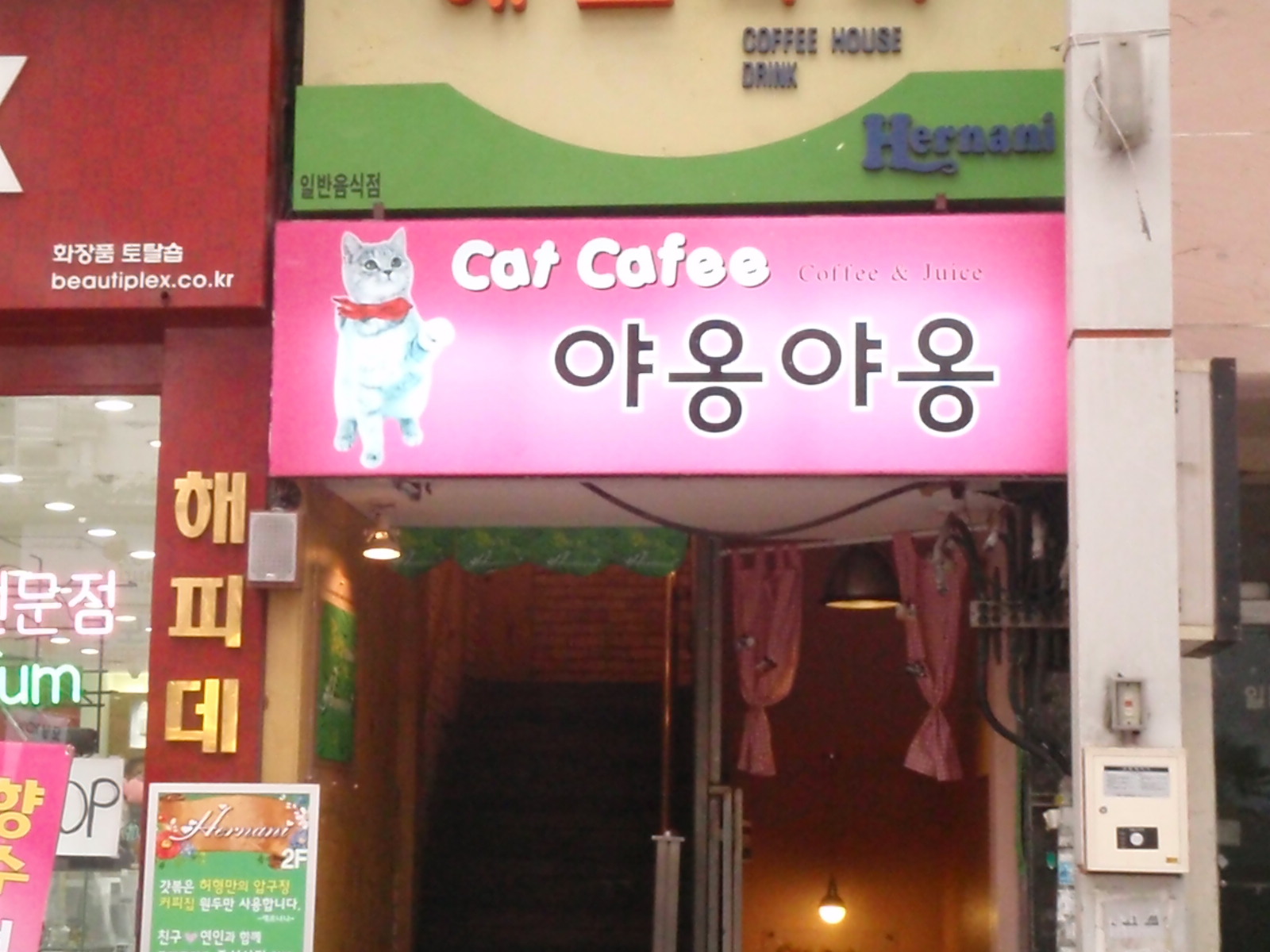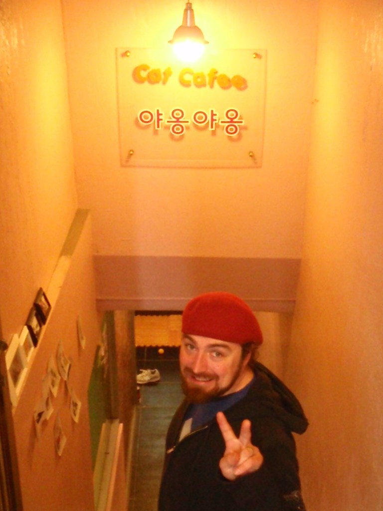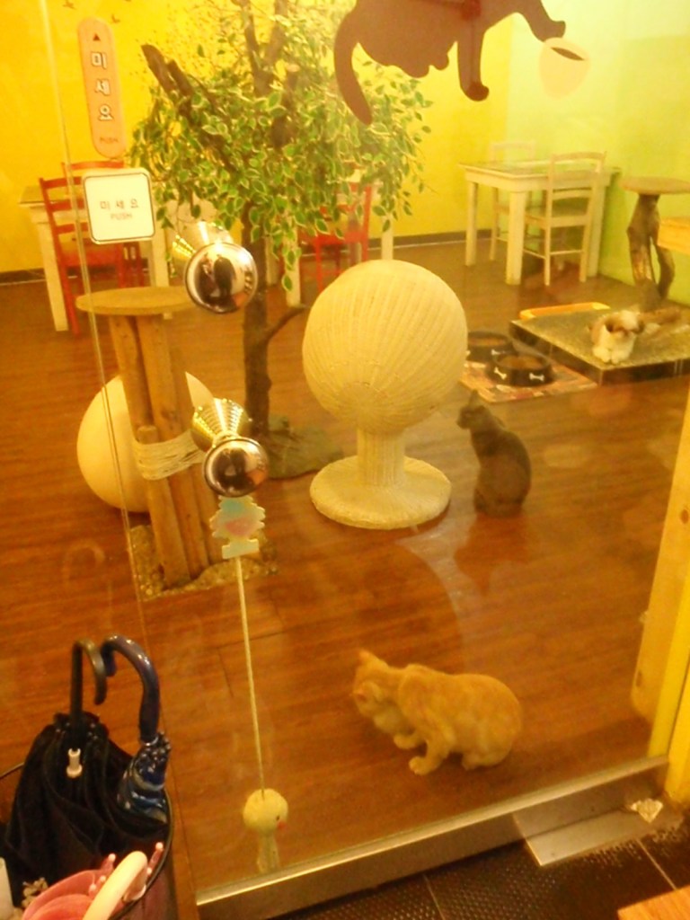 One weekend we travelled to Ulsan downtown to explore the shopping area. After finding it impossible to get a good coffee in Korea, Dan was getting very stroppy and difficult to be around. It had been more than a month without a flat white. We wandered around for a while and turned our noses up at many places that claimed to be cafes. We then saw something we had heard about in tourist books and reviews of Korea. A cat cafe!