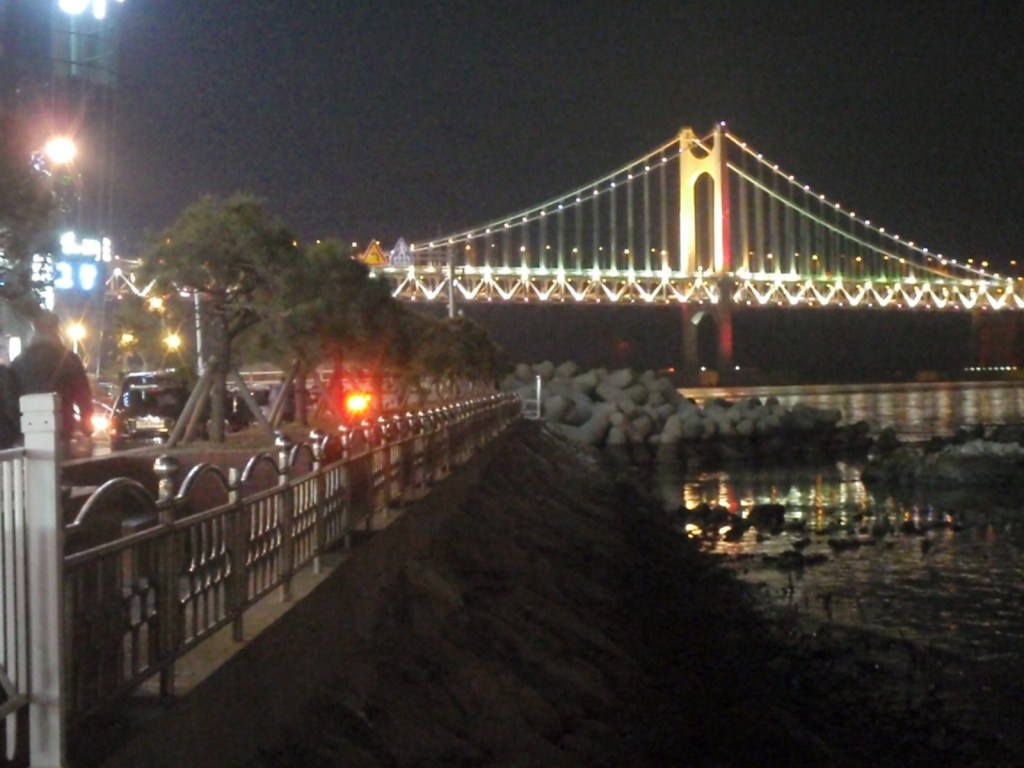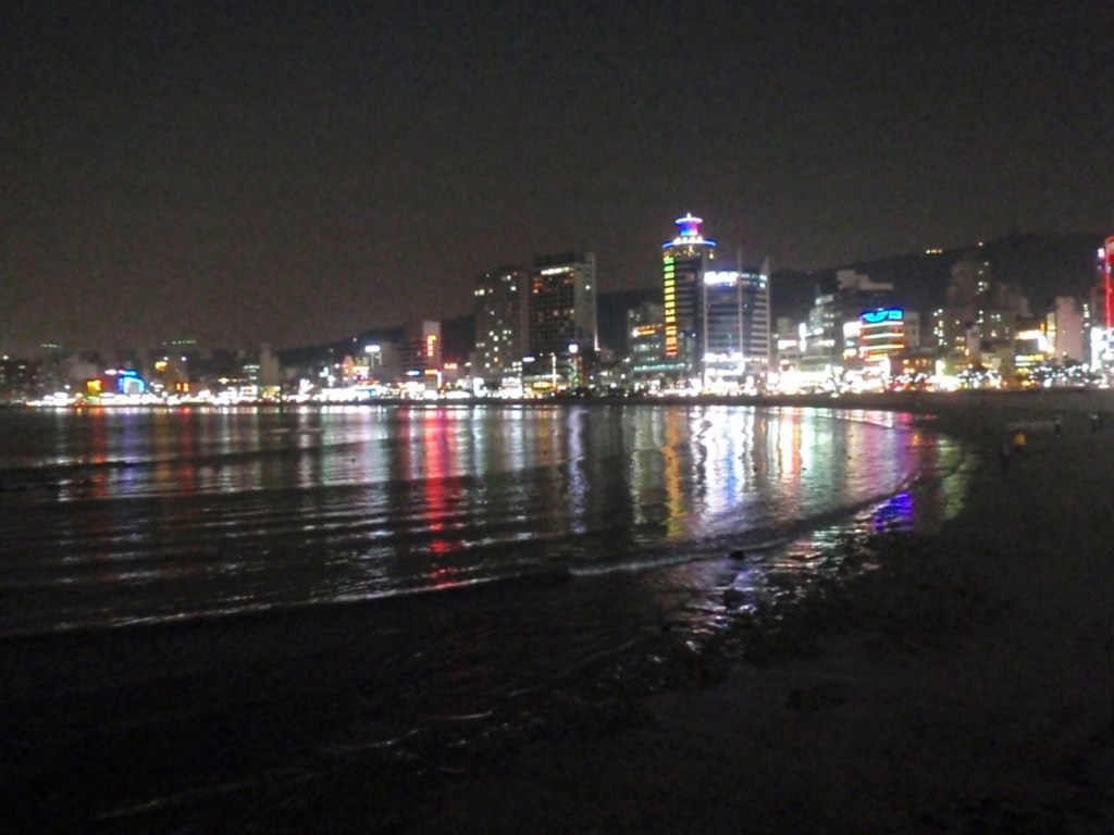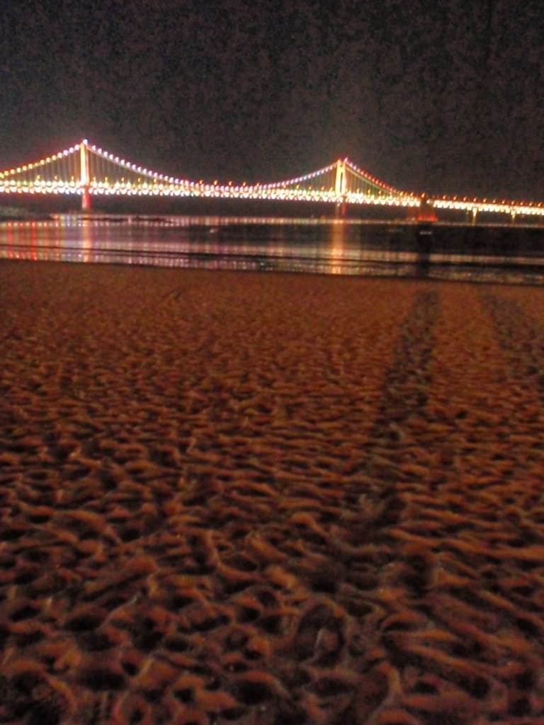 Eagerly we hopped on the subway towards Gwangali and arrived there in the early evening, just as the sun was going down.  Not knowing exactly where Beached (the Kiwi bar) lay it was a 50/50 toss as to whether to head left or right when we hit the beach.  Of course, initially we went the wrong way but it did provide us with a great opportunity to scope out the beautiful area and take some photos of the beach at night.
