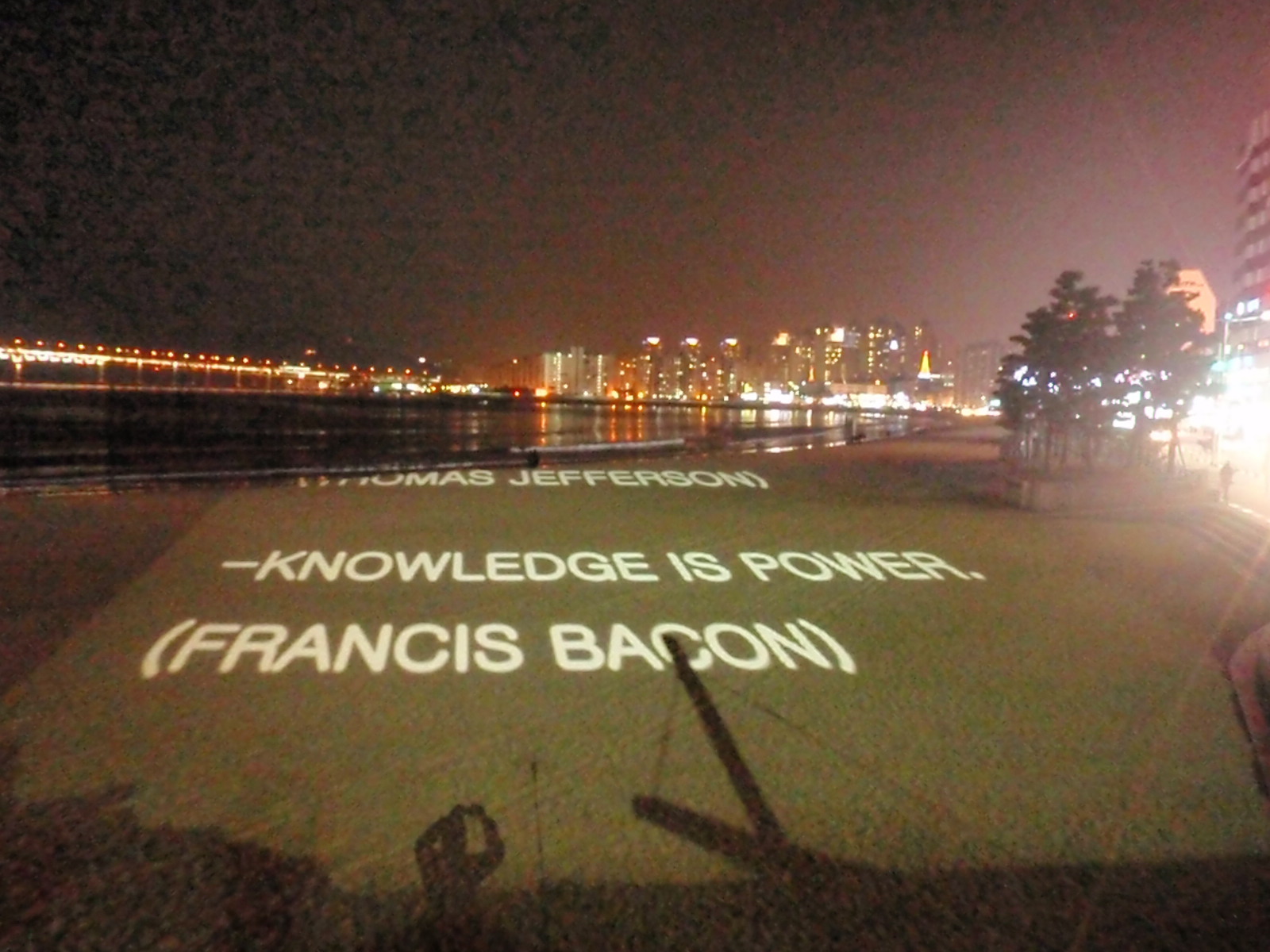 While we wandered down the beach we were surprised to see an art installation being projected onto the beach.  Dan got excited and jumped on top of a power box to take numerous photos of wise sayings….