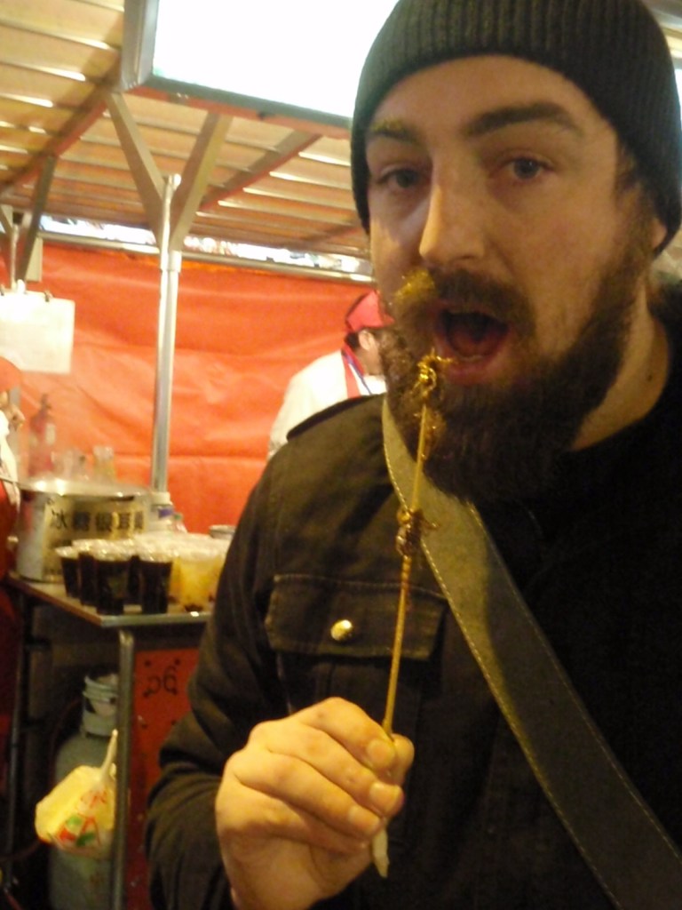 With this post, you two are my new heroes. I like to think I’m an adventurous eater, but I still have a lot of mental/social hang-ups when it comes to insects. So nice to see you two attack the street food with not only no fear, but an enthusiasm that makes me jealous!