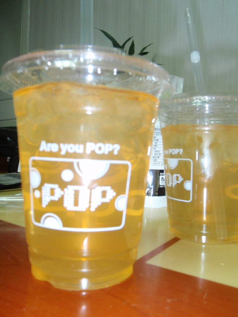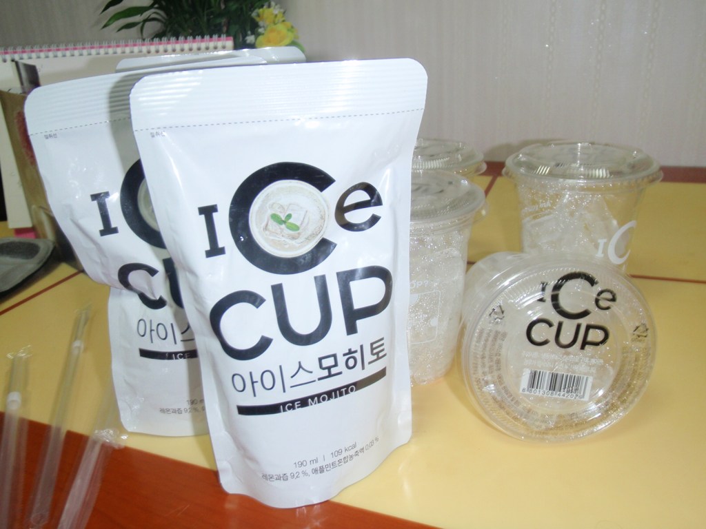 Continuing on our way home we realised we didn’t have much ice in the freezer at home but as luck would have it, H-J had earlier that same day noticed a new product down at the convenience store – cups of ice! Seriously, the Koreans have thought of everything. Picking up a bunch of these we turned to discover that these appropiately named “Ice Cups” have a companion item of pouches of different flavoured juices and coffees. Great idea for impending summer. And great for mixing with previously mentioned bottle of rum ESPECIALLY when one of the flavour pouches is Mojito. Oh, yes, you’re asking for it.