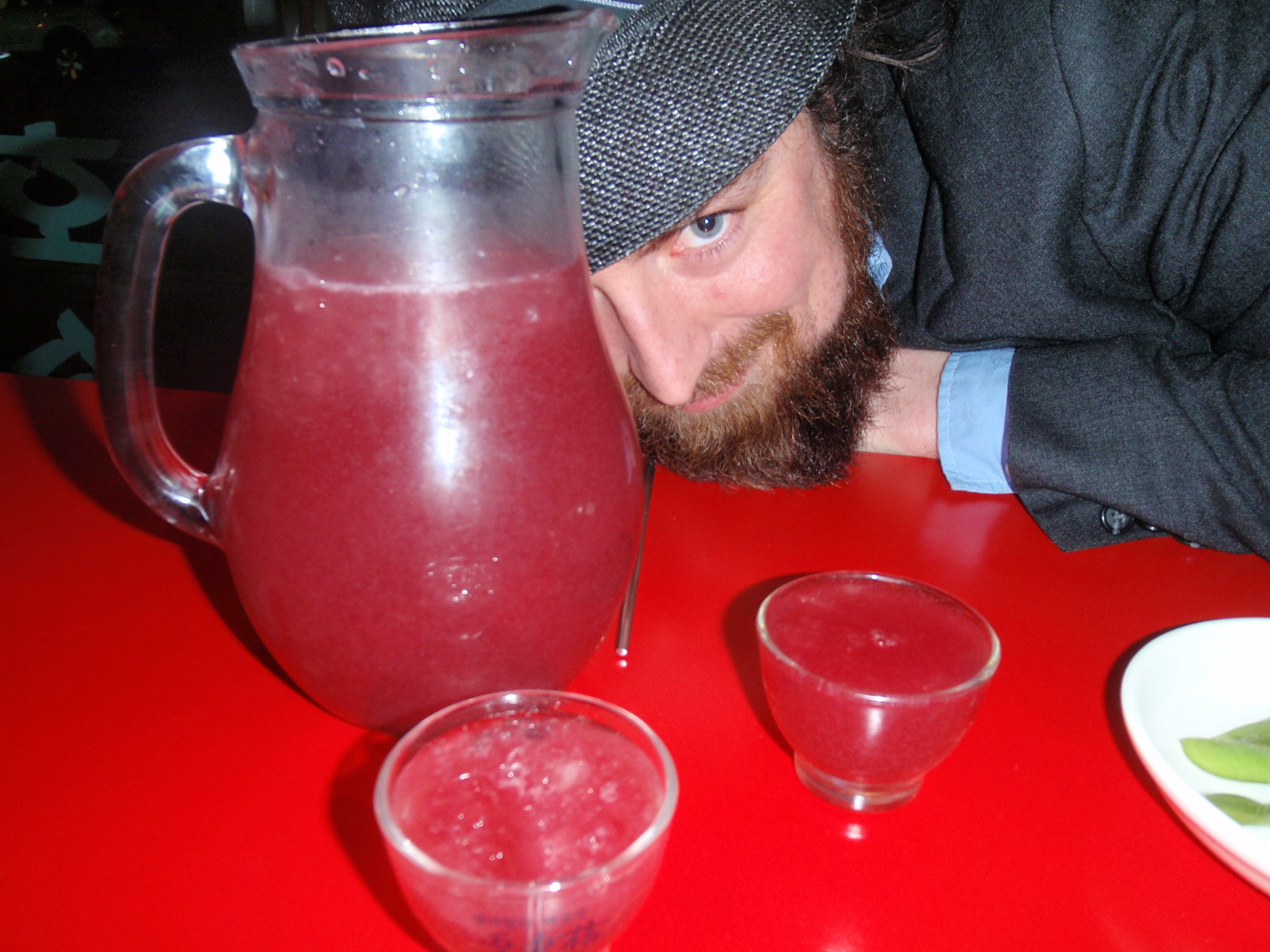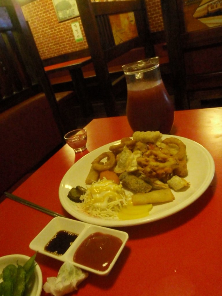 A bottle of rum down, its time to hit the streets and discover what’s to be found in Deoksin’s bars. First stop, for old times sake, is the hof just up the road from our house where we found ourselves back on that first night in the village. And also for old times sake, we order a jug of brightly coloured soju juice and a plate of fried items.