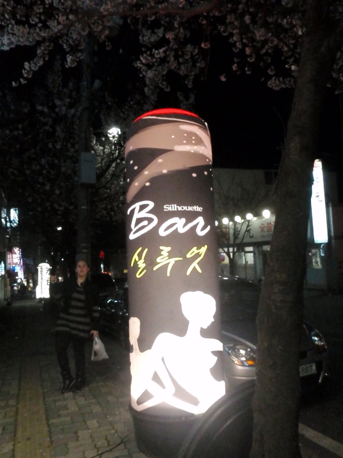 A feature of bars in Korea is that often you can only buy full bottles of alcohol. Knowing our limitations, we decline the litre of Absolut place in front of us and the lovely English speaking bar-tender pours us generous shots instead which we top up with little cans of Jeju Island Tangerine Juice. Yum. As there are three bar-tenders working each group of customers gets their own, so to speak, while one attends to the beautiful private curtain-lined booths along the side of the wall. It turns out that our bar-tender is a fashion design student at a University in Busan and just comes to Deoksin to work. Its a lovely spot to sit and chat with her (and each other) and sip our drinks while admiring the blossom.