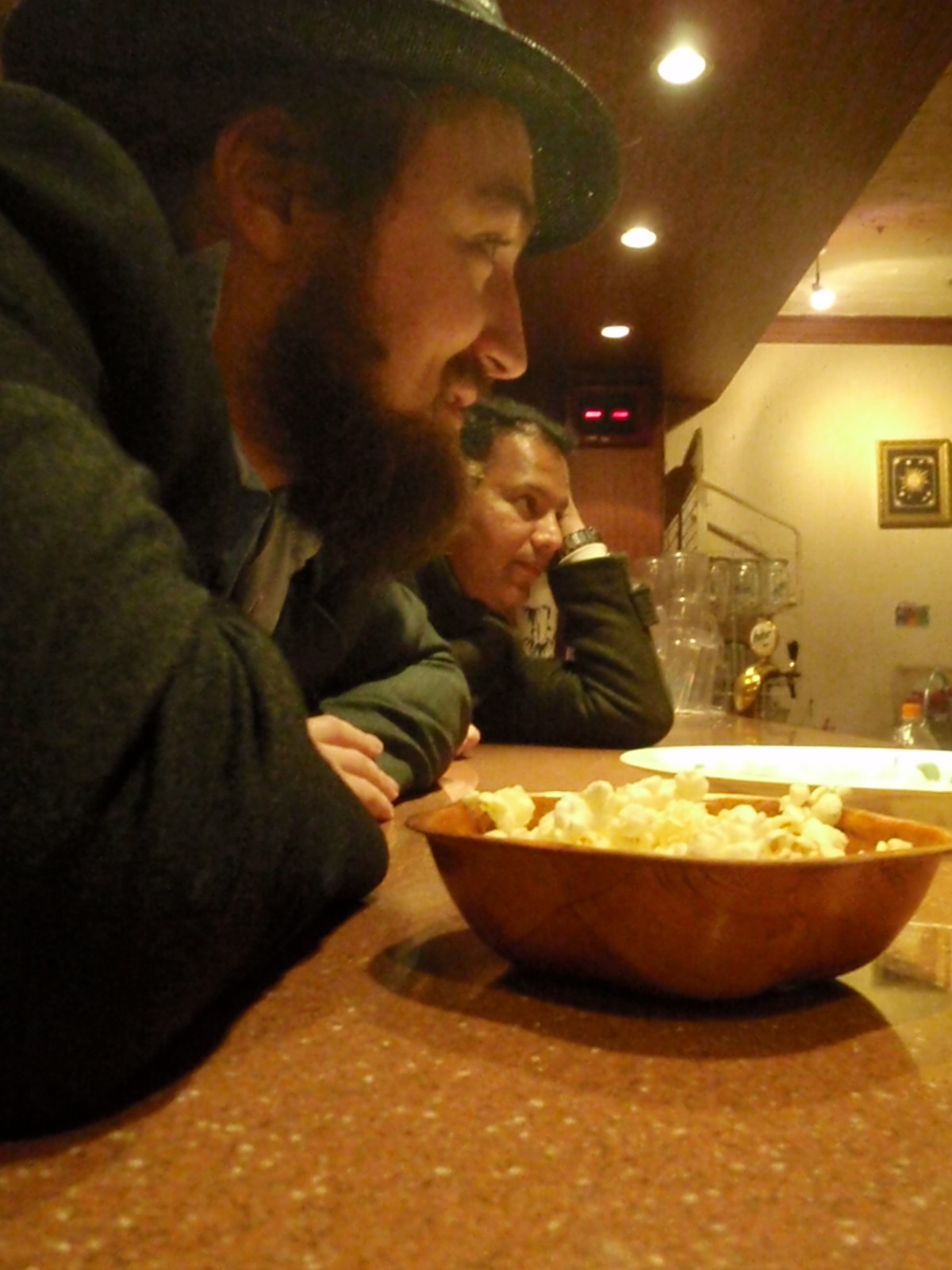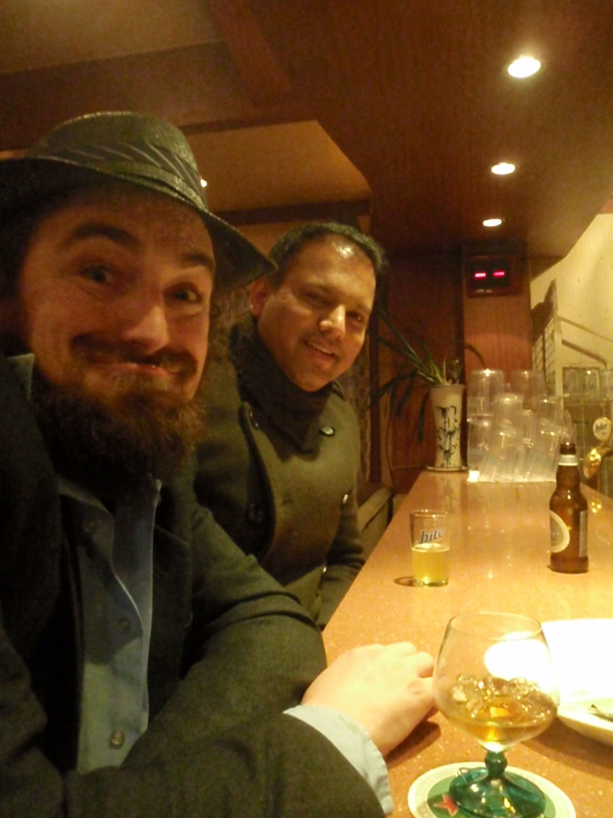 Anyway, we take our seats at the bar and all of a sudden feel large hands clapping down on our backs. We turn to see the Mapia guy from the first bar, standing their grinning, pointing at the bar and then to himself and saying “owner, owner”. Cool.