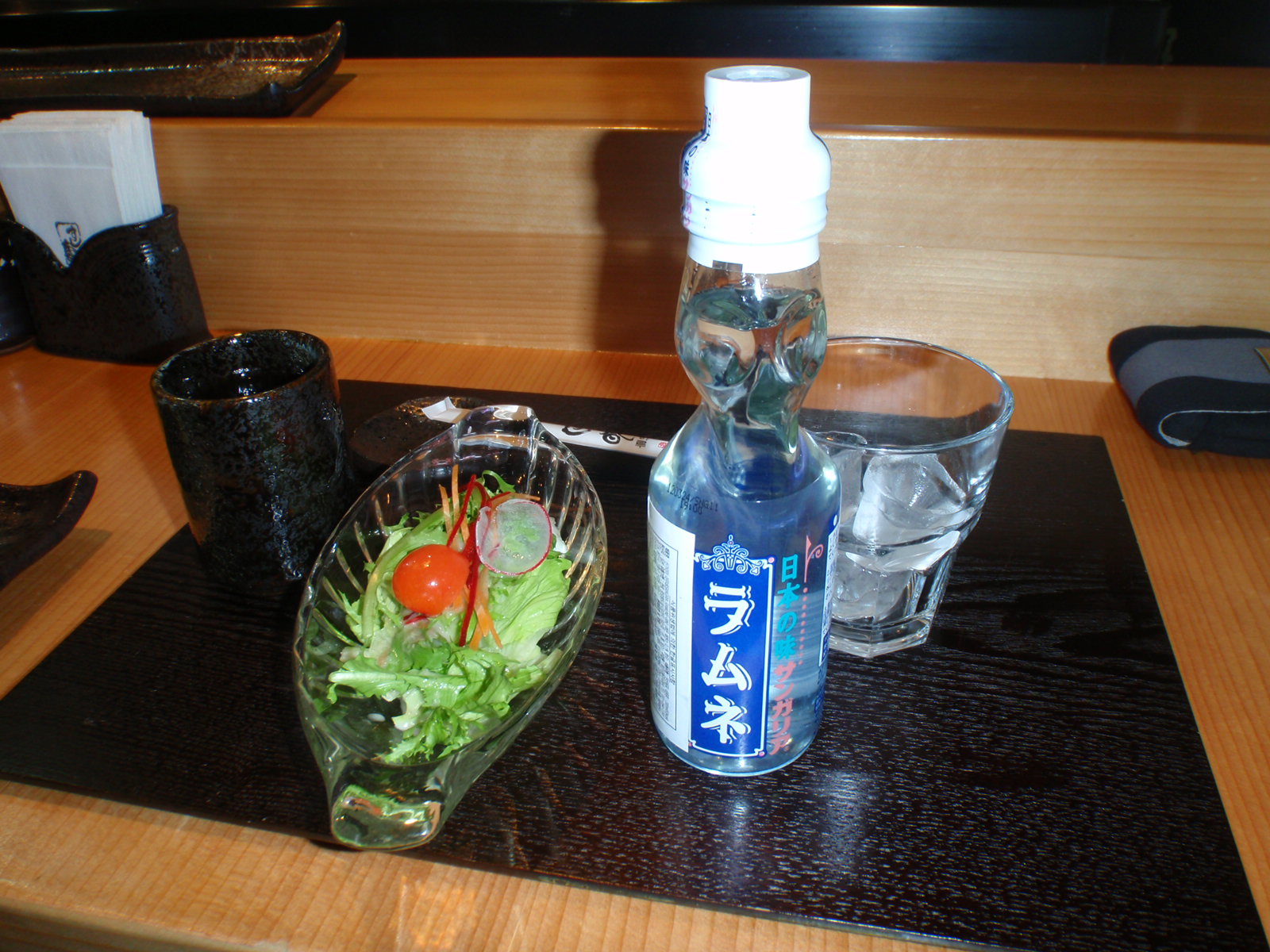 Our drinks and salads arrived next – a crisp, refreshing Asahi for H-J, while Dan tried something new recommended to him by the chef. Named Ramune ラムネ, it tasted like bubblegum! The bottle design is pretty cool in itself, made of glass and sealed with a marble. Definitely an snazzy thing to drink at your next party!
