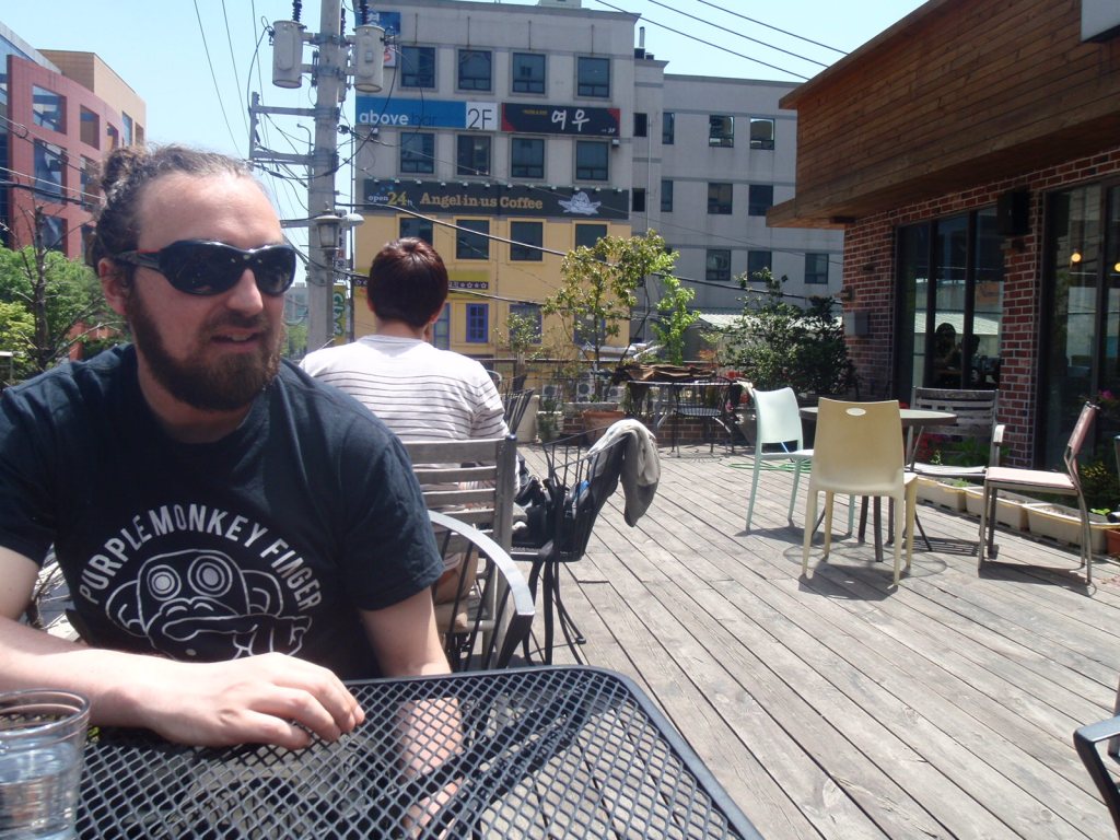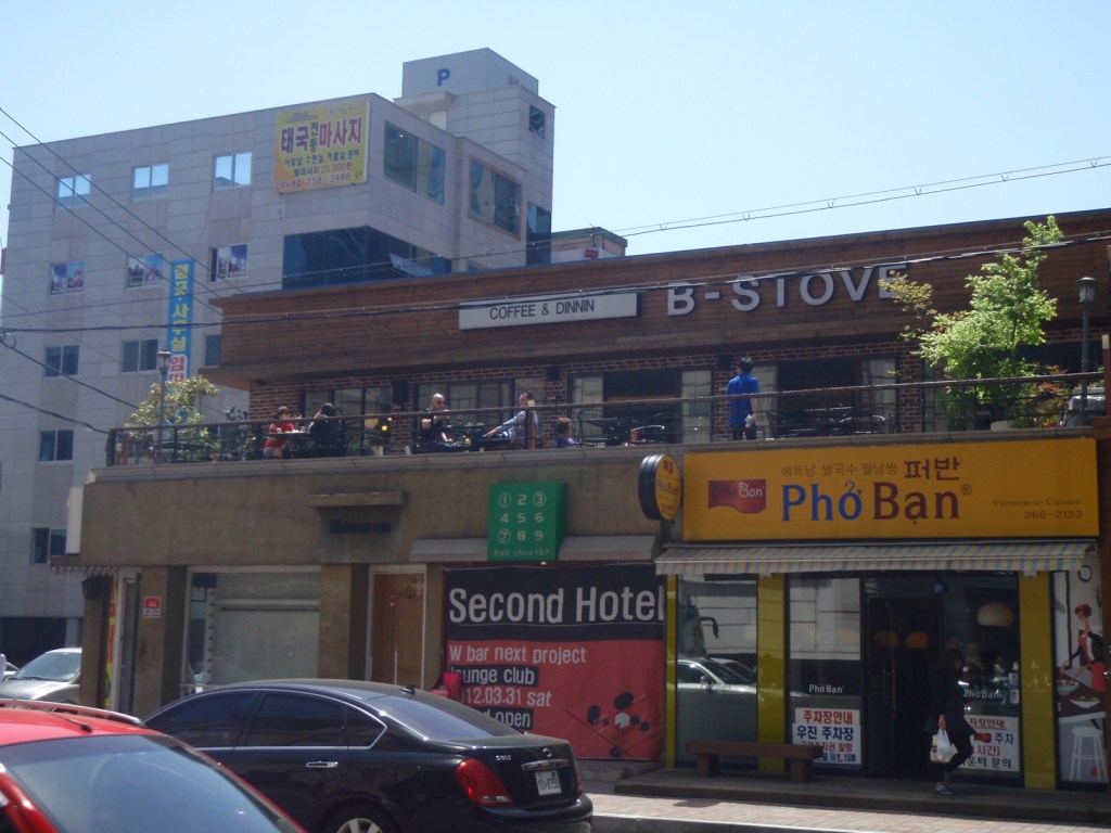 A place called B-Stove immediately caught our eye. Two things really pulled us – the sun filled balcony looking over the street, and the cafe’s wonderful tag line ‘COFFEE & DINNIN’. As you can see the work that we and many other English teachers in Korea do has really paid off.
