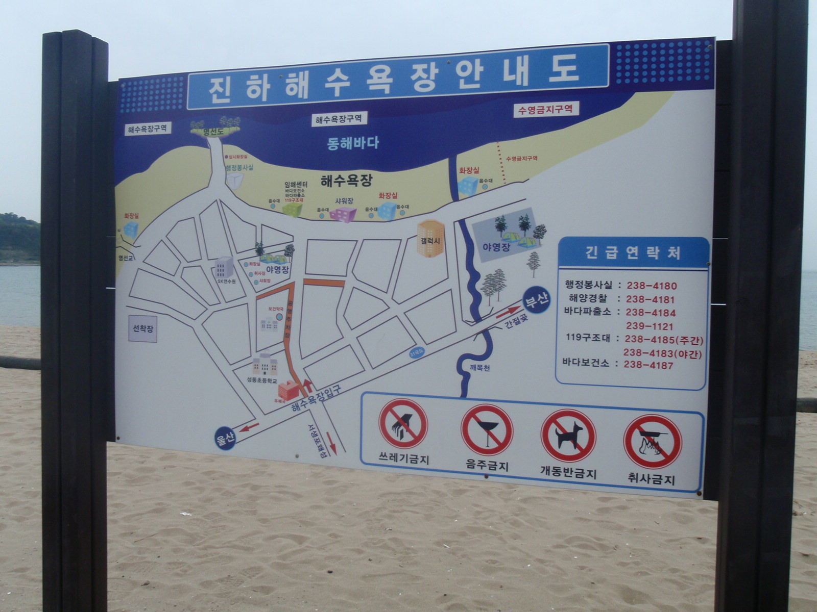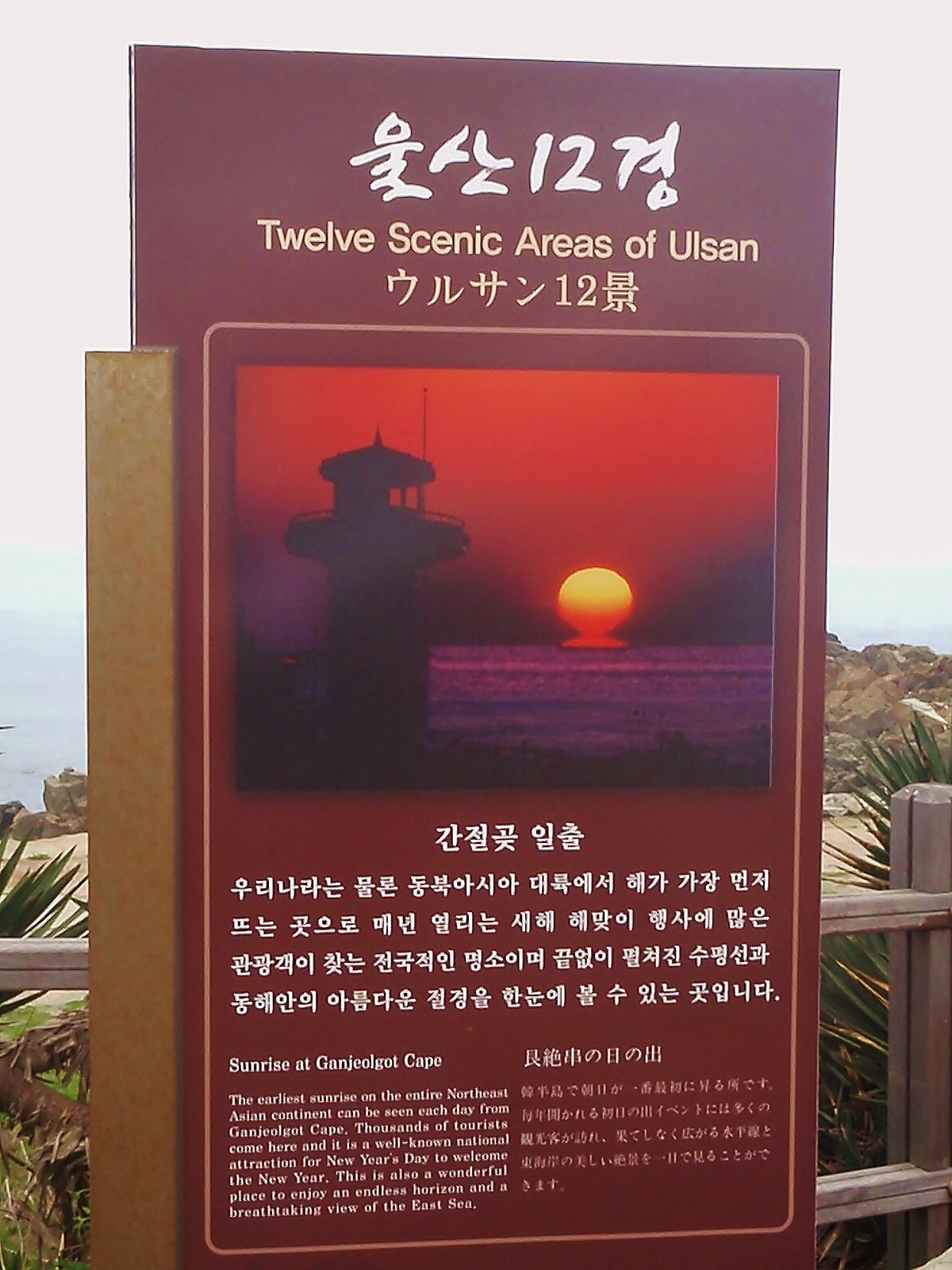 Anyway, its the place where the sun rises first in north-east Asia, located on the south-east Korean peninsula and, more suitable for our purposes, “surrounded with many tourist attractions”…which are listed as pine forests, rocks (we kid you not) and Jinha Beach.