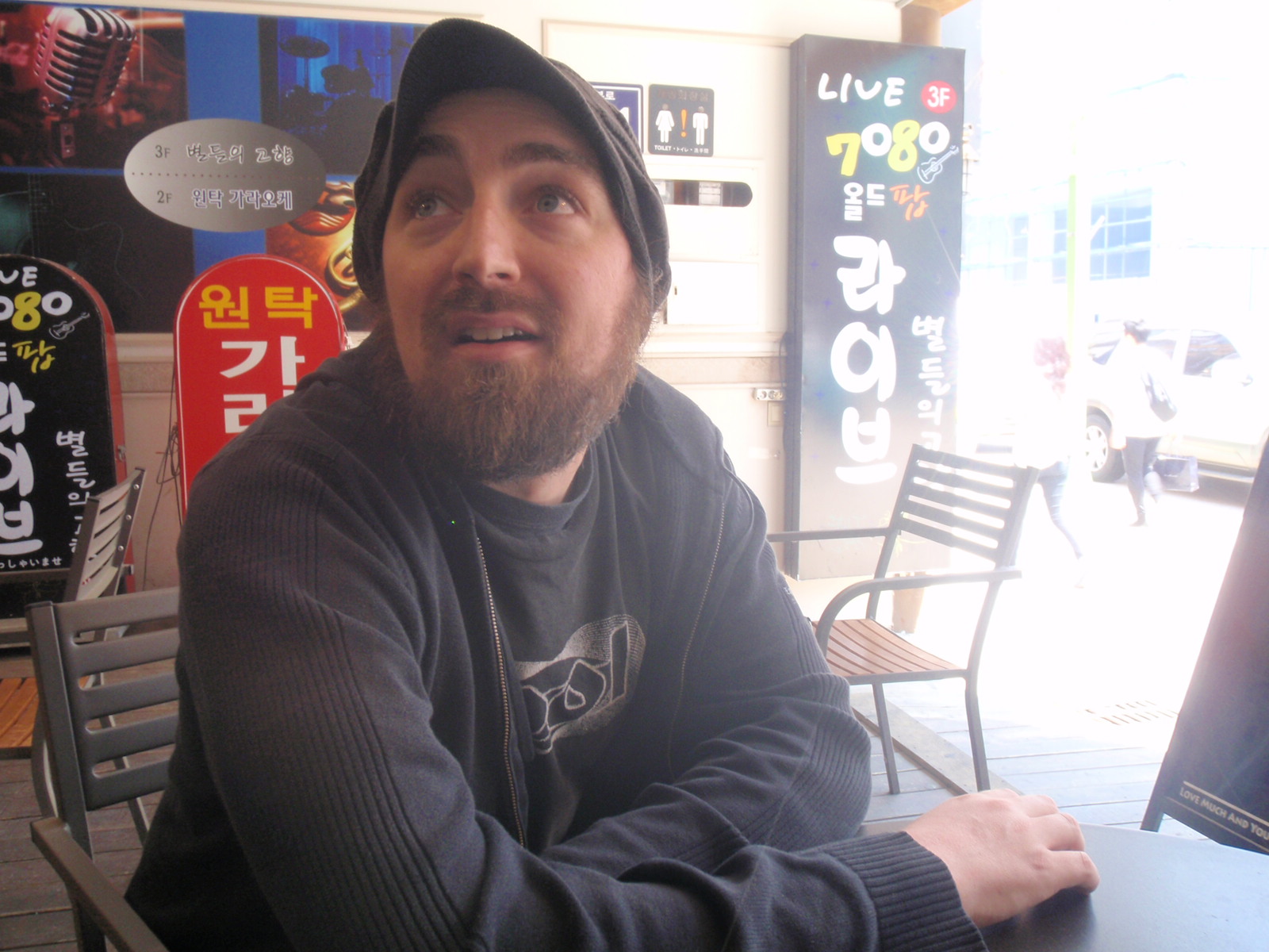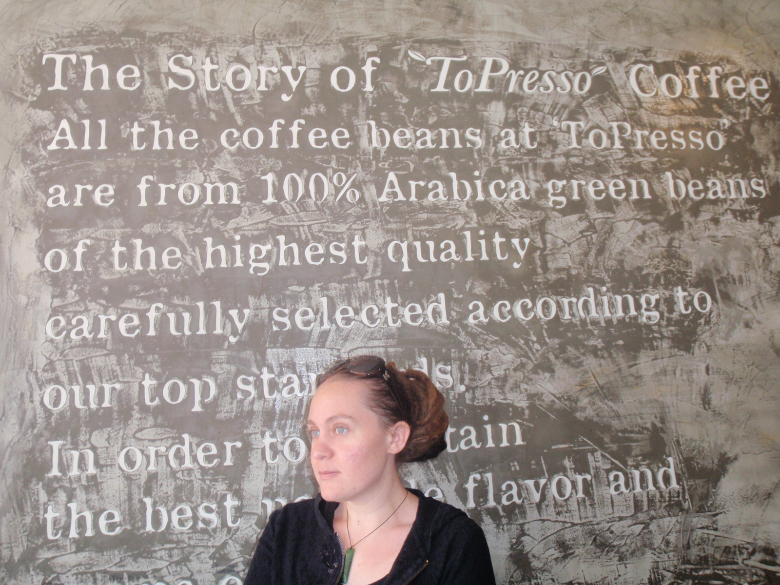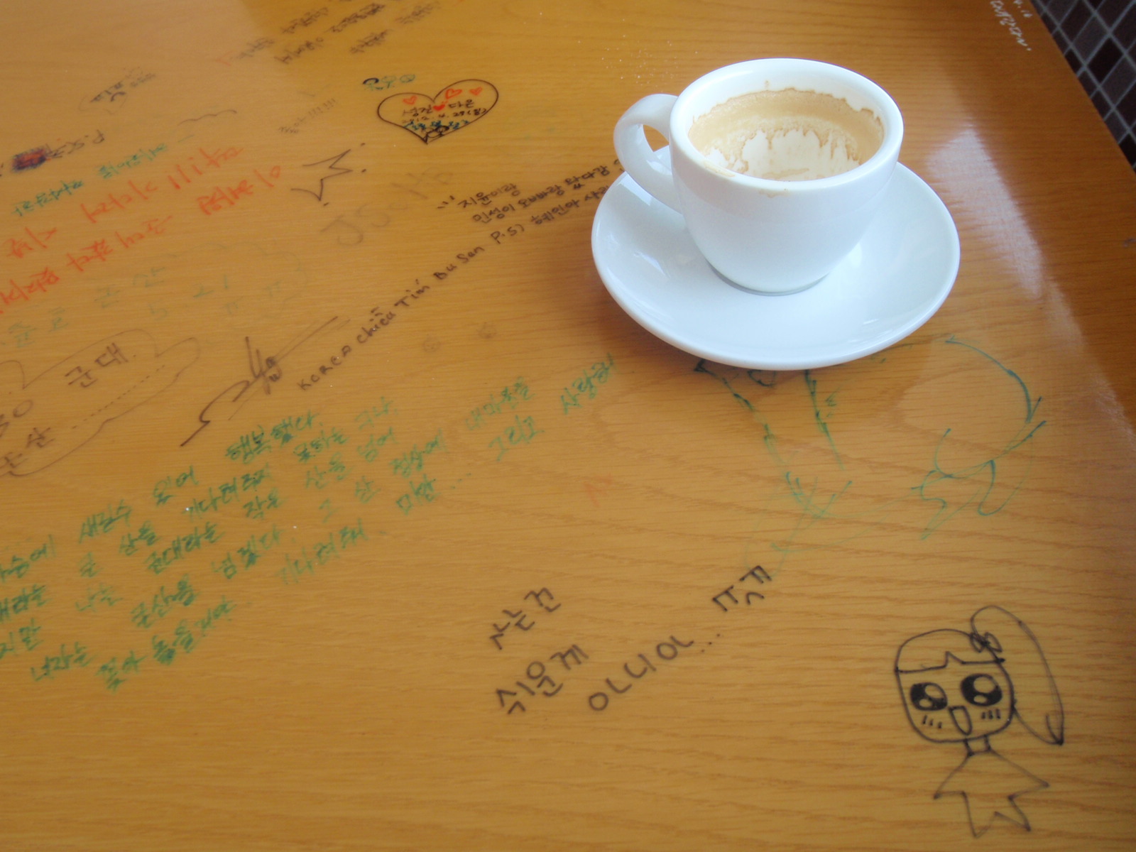 Not all was lost however…having arranged to meet our friend in Nampo-dong (not sure why, nothing we wanted to do was there but hey, its a cool area anyway) we sat down and fueled up with the first coffee of the day.  And took wanky photos of ourselves while we waited.
