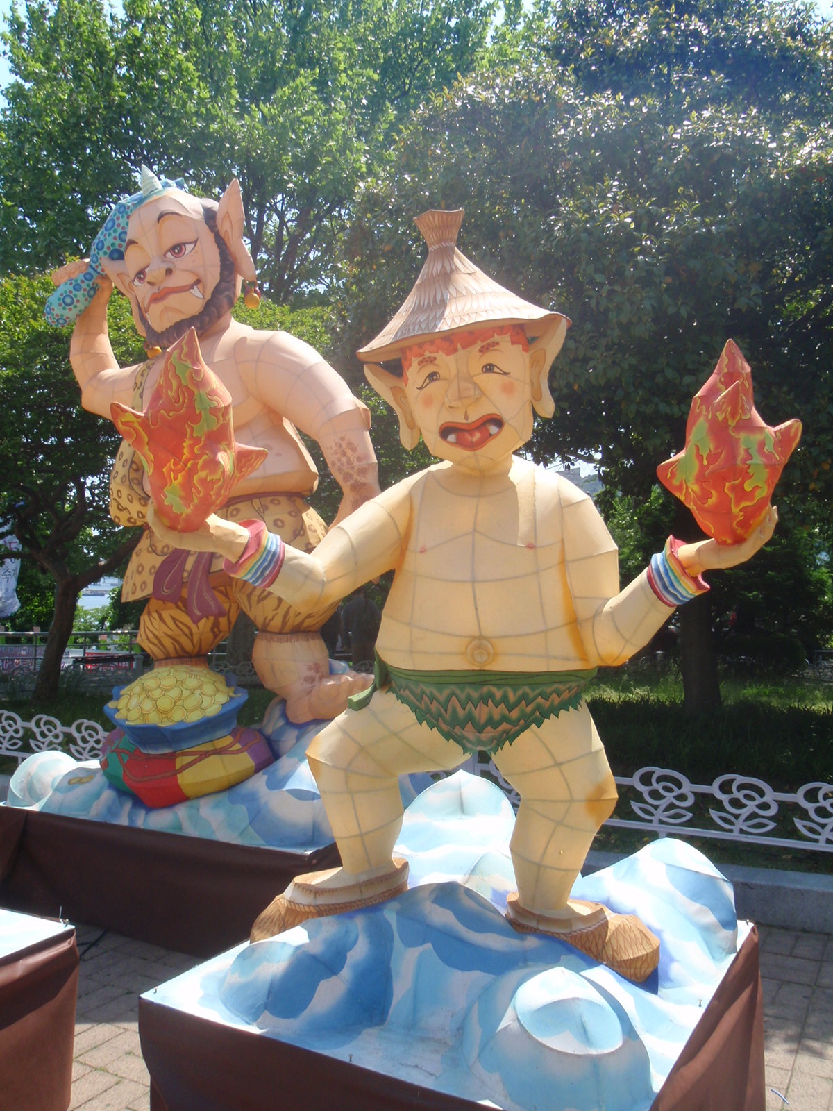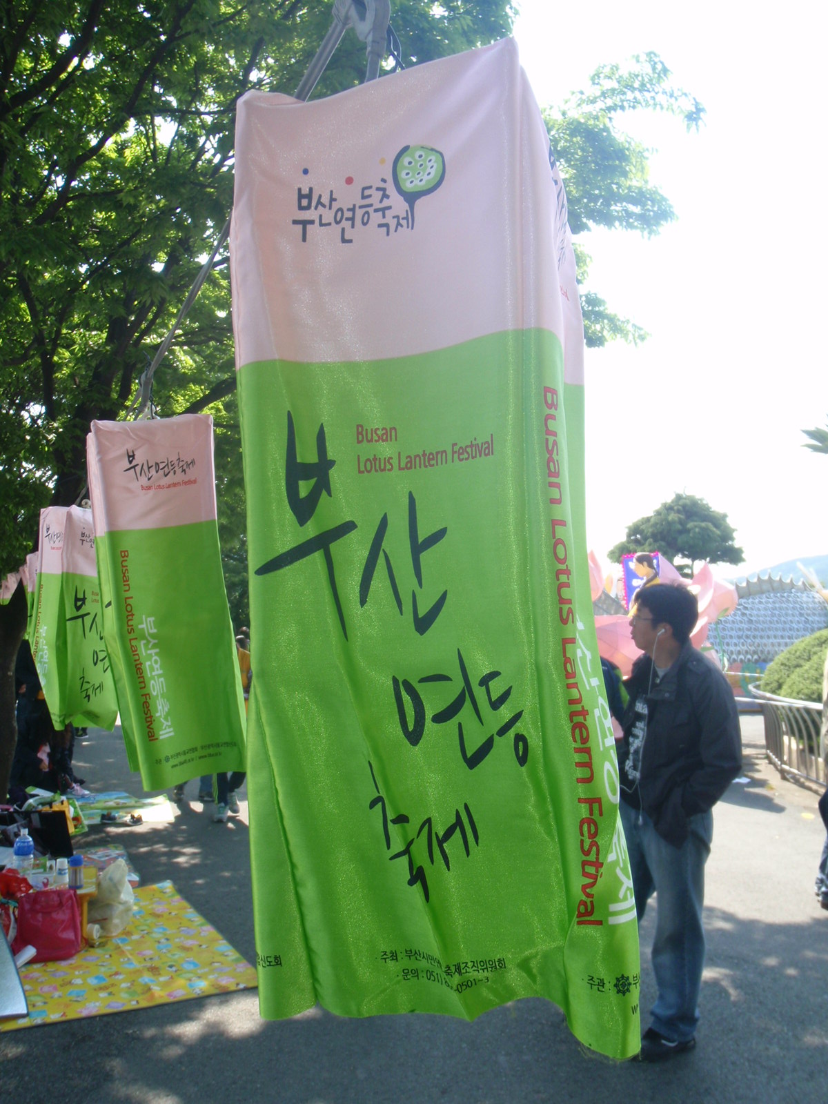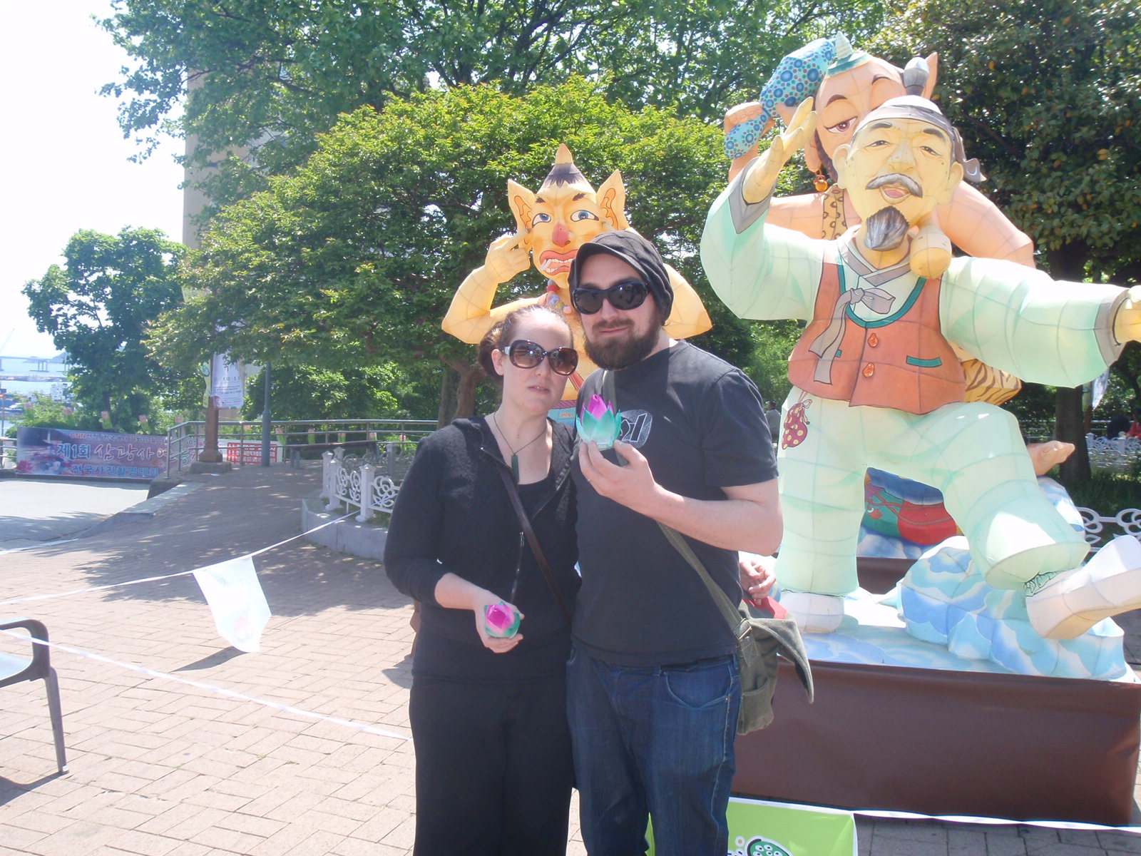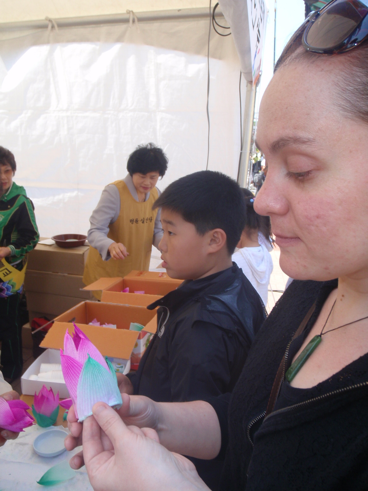 Heading through Yongdusan Park toward the tower, we suddenly realised that we bang smack in the middle of the Busan Lotus Lantern Festival.  People were everywhere, there were weird inflatable creatures dotted around the place, monks were wandering about and there was even a craft stall where you could make your own lotus lamps.  We were dragged over to ‘enjoy’ craft time before we knew what was happening.