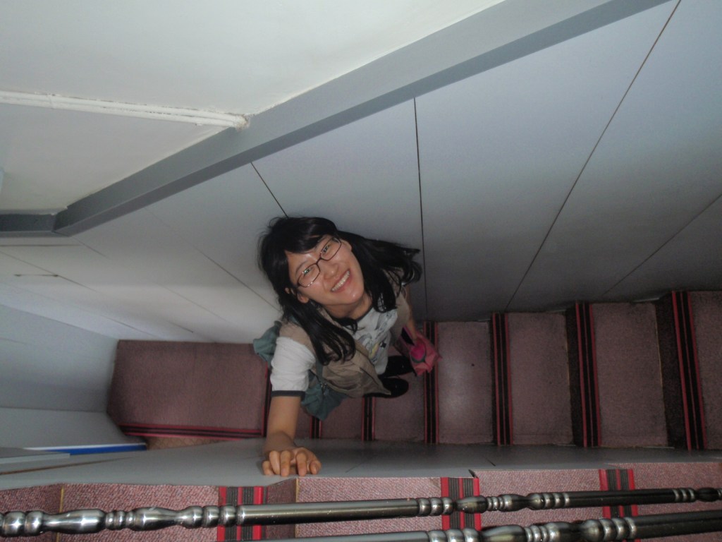 In true Dan & H-J style, the mere lure of a cafe puts the smiles back on our dials.  Which is just as well as the narrow stairwell prompts yet another round of taking our photos….