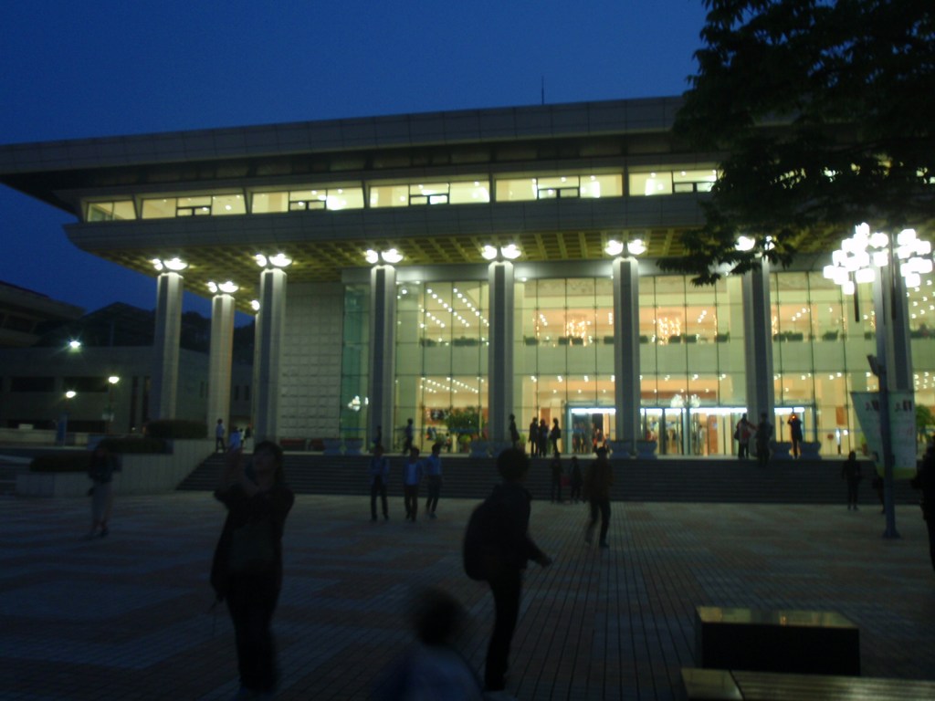 We thought wrong.  But it didn’t matter, we still got there with plenty of time to pick up our tickets and see the show.  The Busan Cultural Centre is a massive, beautiful building perched atop a hill in Daeyon, looking down over a gorgeous nighttime view.  Unfortunately, our getting-crappier-by-the-day camera couldn’t quite capture this so we’ll just throw in a picture of the building instead.