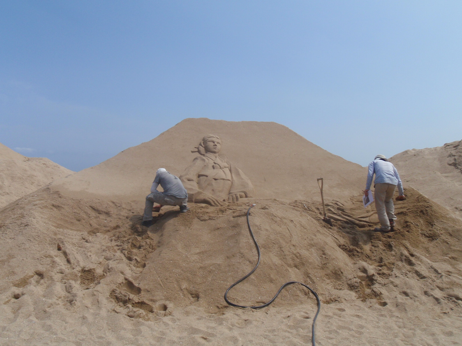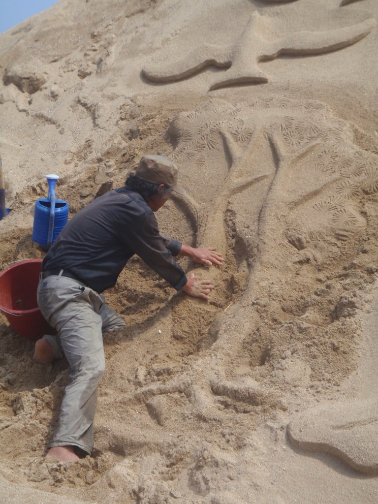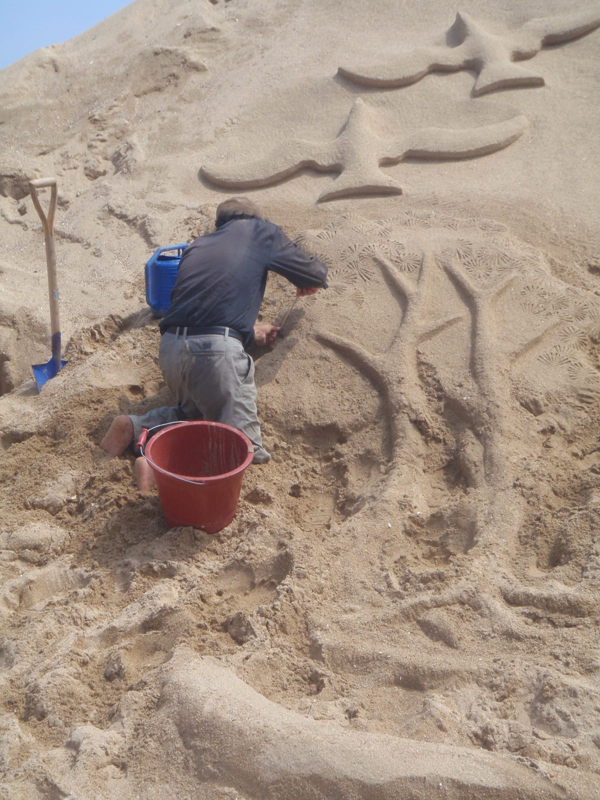 Down the the busy beach guys scuttled away producing amazing sculptures on the man-made dunes.