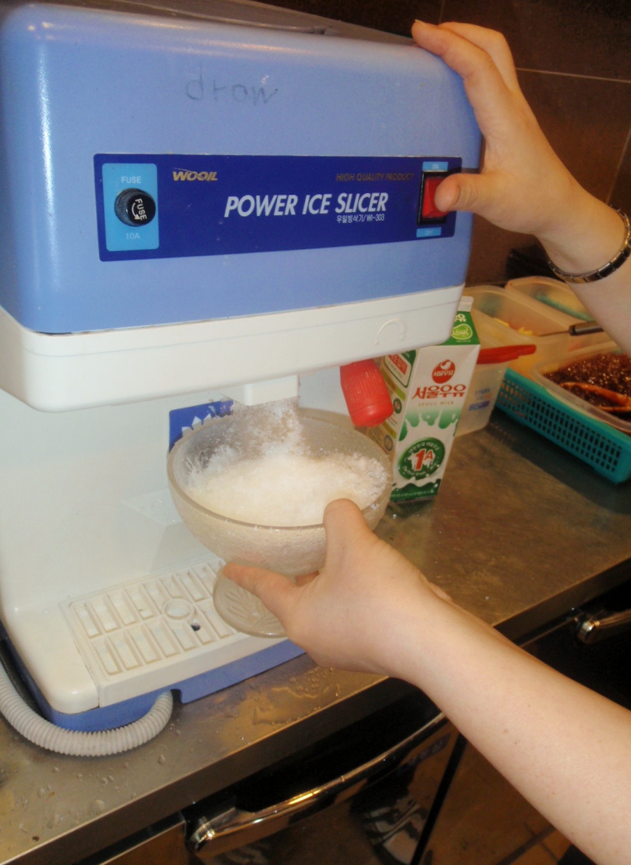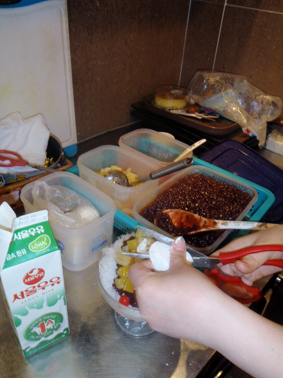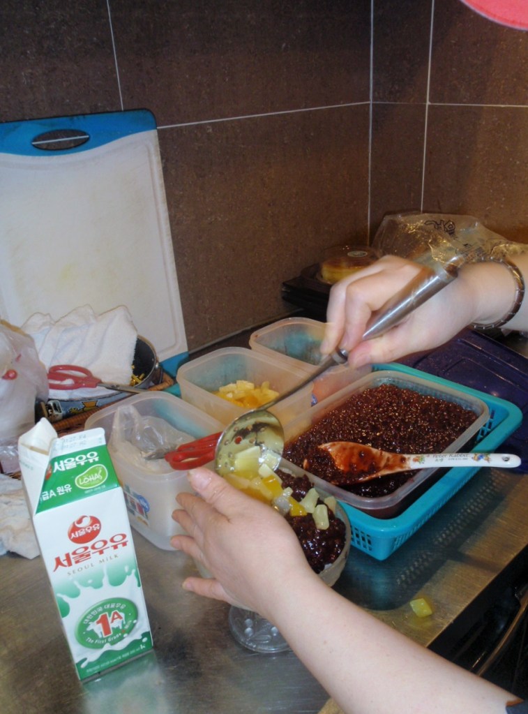 Then she smothered some sweetened azuki beans (sweet red bean paste also known as pat, 팥) over the top.