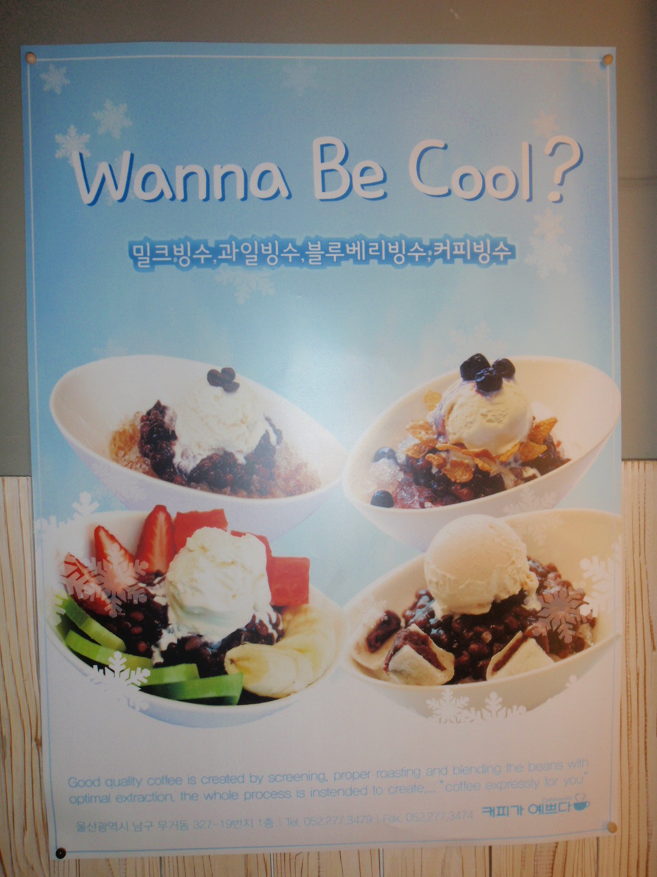 Speaking of cafes, we couldn’t help ourselves and upon a recent visit to Ulsan we popped into our favourite coffee spot, Cafe Bonito. We discovered this place very early on in our travels in Korea and had been lured in by the fact that its also a barista training academy; being the coffee snobs were are, we figured they might actually do a decent coffee! Its been one of the few places in Korea that we’ve gone back to time and time again due to the ability to get something resembling the super high standard we’re spoiled with back in New Zealand. This time however, a cheeky sign greeted us as we headed up the stairs…