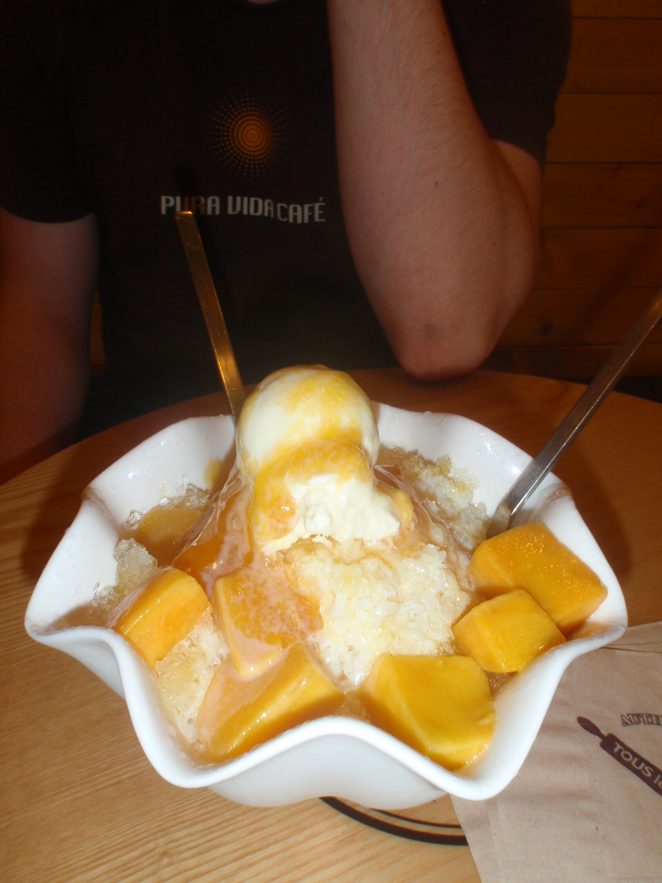 Last destination on our patbingsu hit-list was another ubiquitous pseudo-French named Korean bakery, Tous Les Jours. Perhaps riskily, we decided to give the fruit theme another try and duly ordered the Mango Tango Patbingsu.