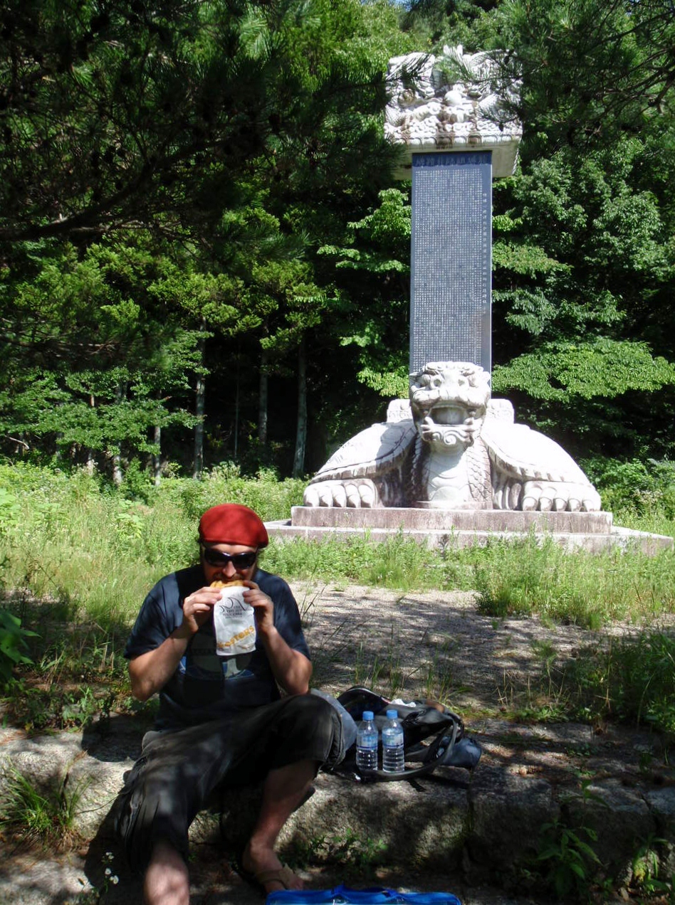 As we commenced the stroll up the path toward the main temple, we were distracted by this awesome looking dragon statue. Accordingly, we decided that it was a great location for a spot of breakfast bacon and egg pie, purchased the night before in a fit of pie lust and general good planning!