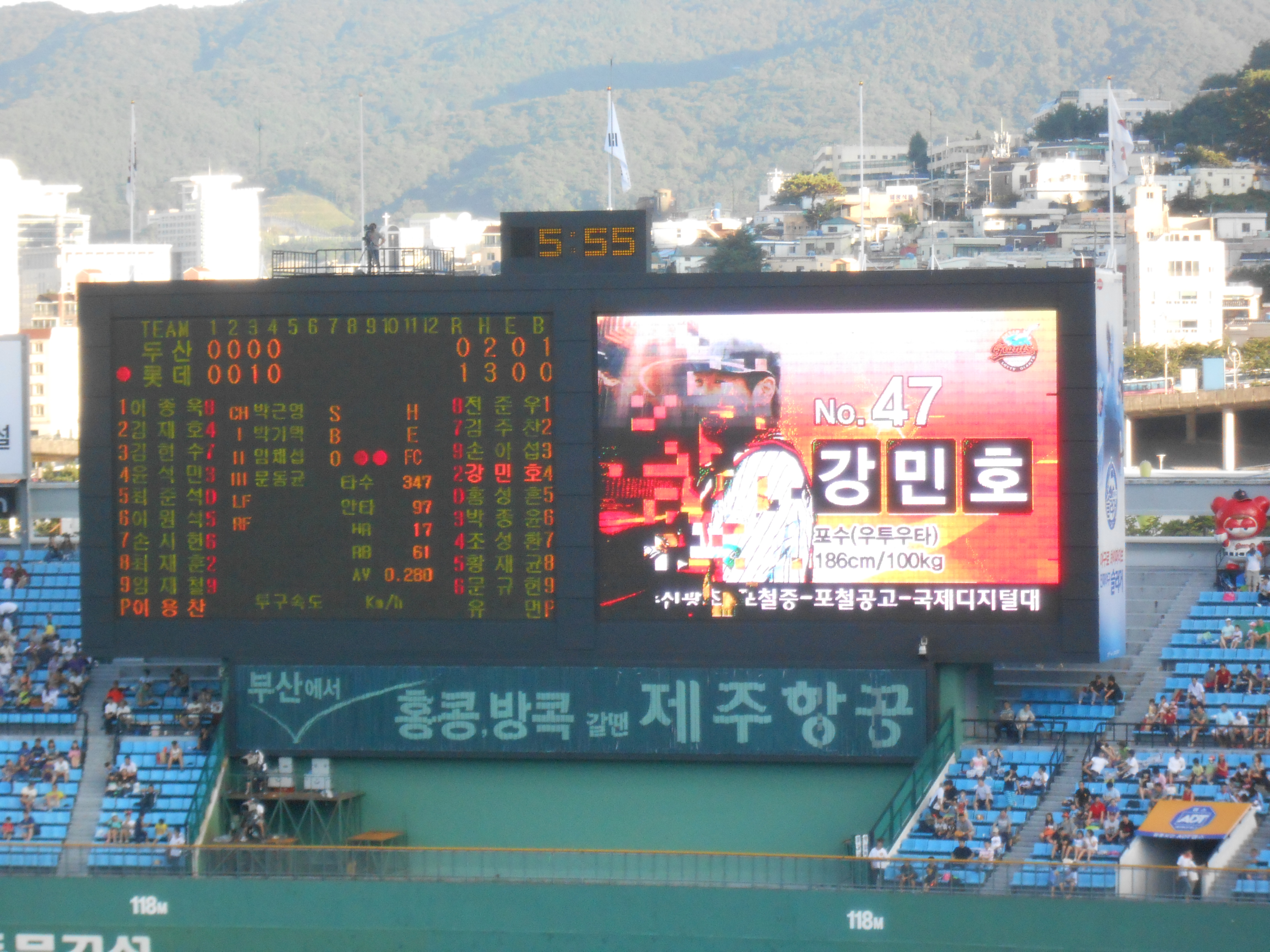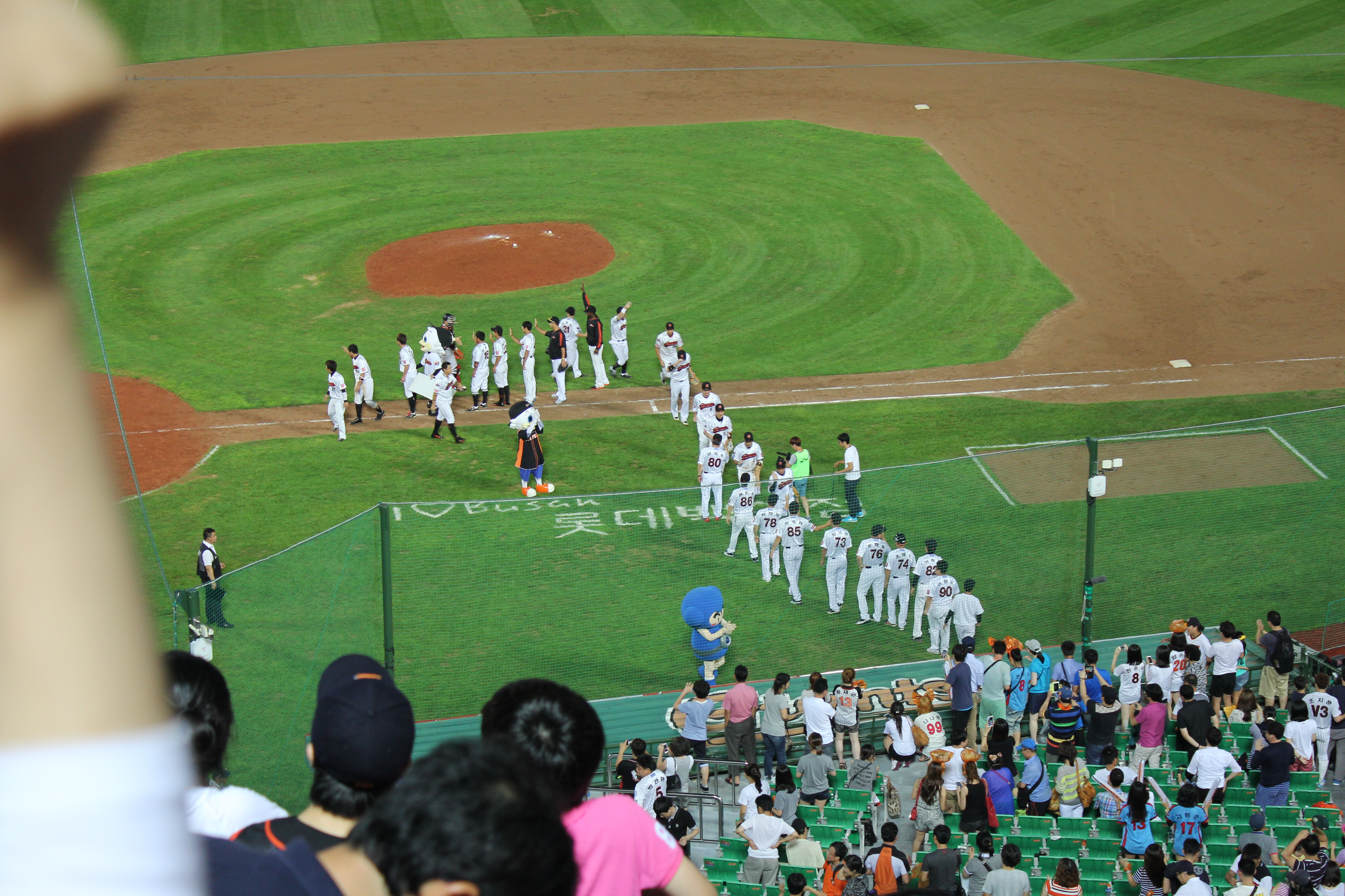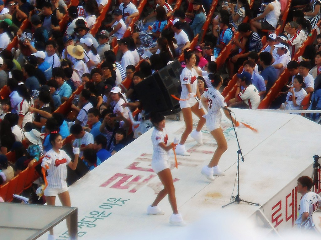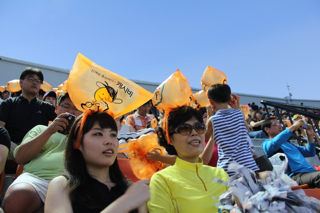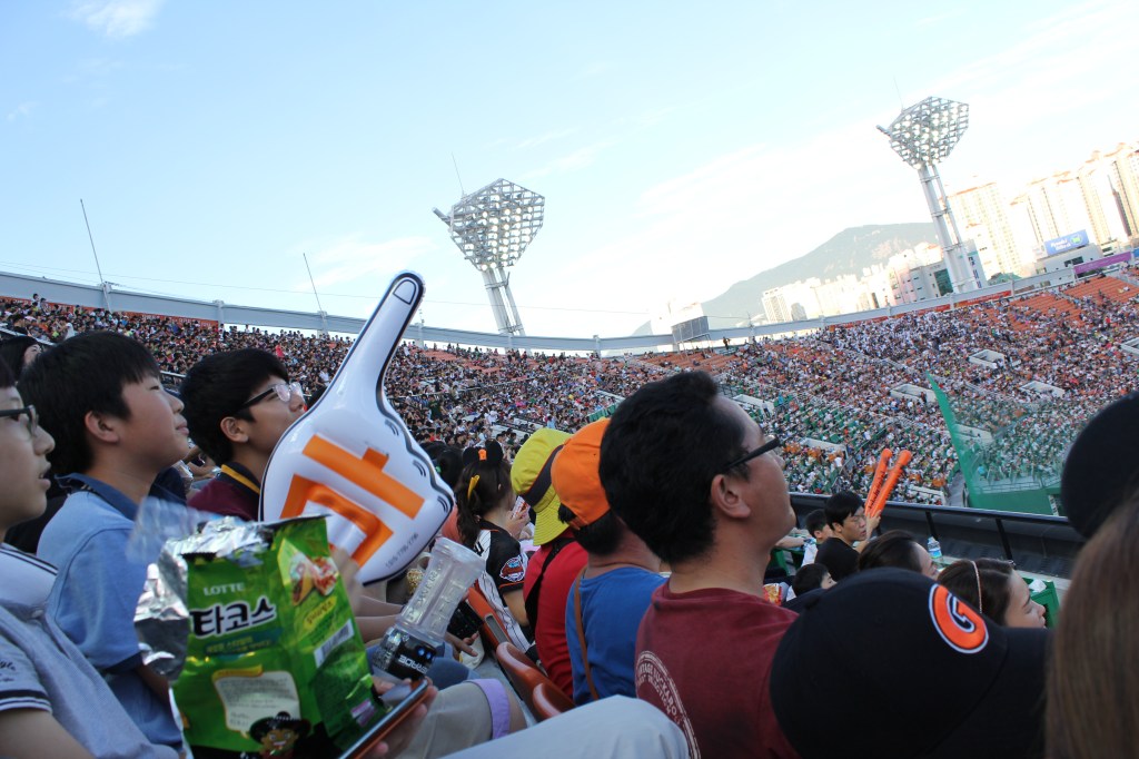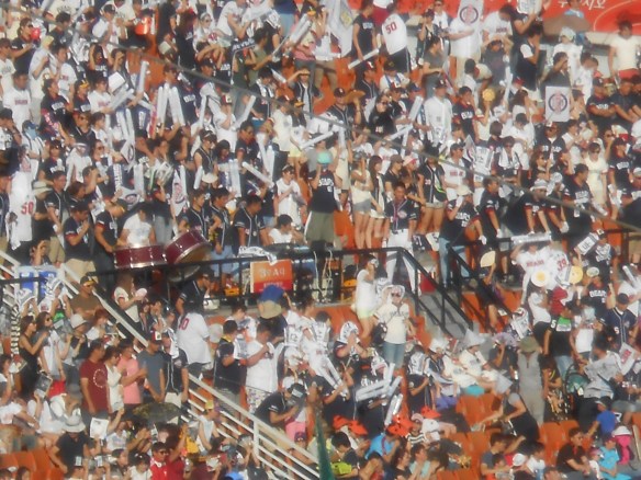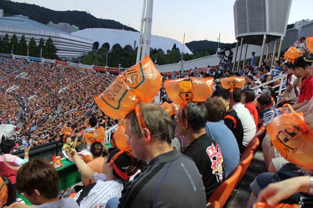 Of course, we can’t talk about baseball in Korea without mentioning perhaps the most striking feature…each team in Korea is named not after where they are from, but rather the chaebol (a form of state-sponsored multinational, in Korea predominantly the family owned corporations like Samsung, Hyundai etc) that own them.  So no ‘Busan’ Giants, but instead the Lotte Giants.  And what happens each time the crowd start chanting?  “Lotte, Lotte, Lotte, Lotte.”