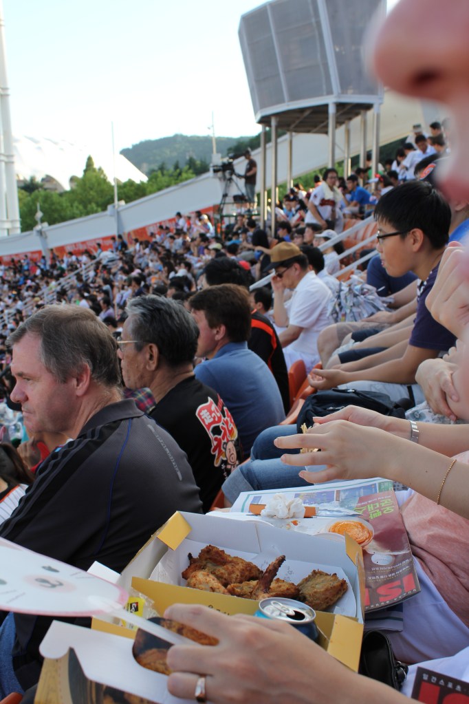 The place was packed with fans picking up tickets, running around excitedly and stocking up on snacks and drinks for the game.  Like most places in Korea, food of every kind imaginable is available nearby as well as inside the stadium.  And unlike most of the rest of the world, you can take in whatever you like.  New York size pizza?  Sweet as.  Family size tub of ice-cream.  No worries.  Crate of beer – sure!  But don’t worry, if you forget anything, plenty is available at the venue itself, either from the many vendors lined up on every level of the stadium or from the hawkers trawling the stands non-stop during the game.  And yes, you can get chicken delivered directly to your seat.  Oh and we should mention that prices inside the stadium are the same competitive prices as anywhere else.  Gotta love the land of convenience.