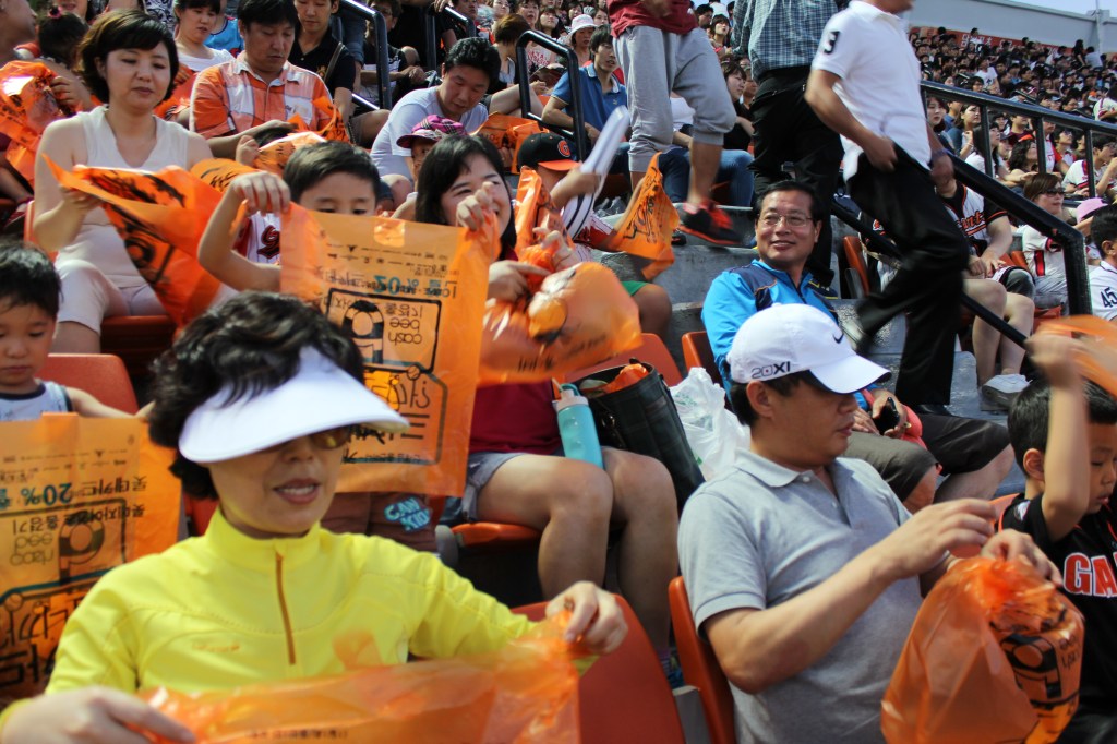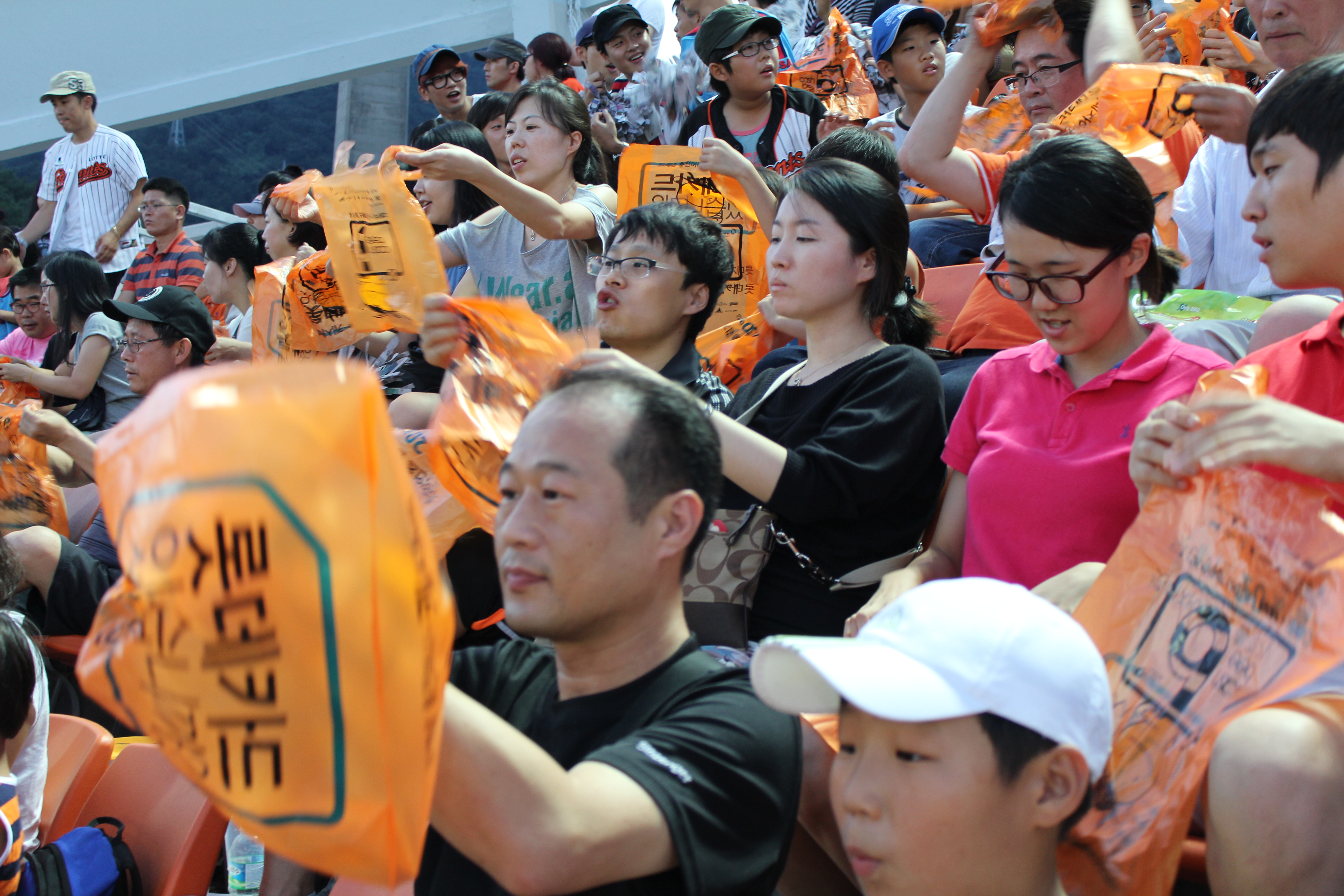 And then, just before the 7th innings, something even stranger happened.  Everyone in the crowd was given a bright orange plastic bag to put their trash into…but in Busan, instead of filling them with their scraps, the fans blow up the bags and tie them to their heads, creating a sea of orange!!!
