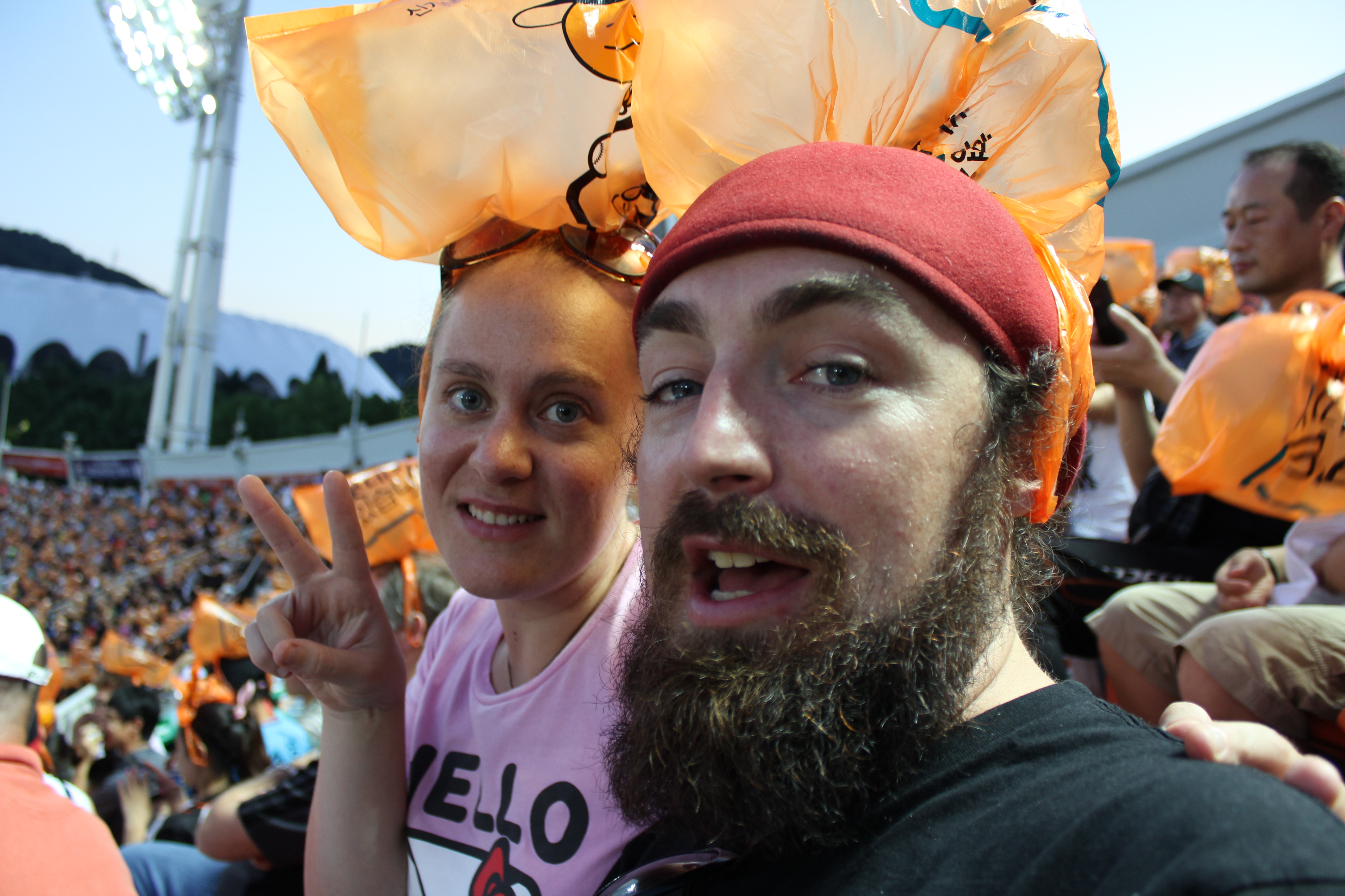 When the players finally emerged, the scene blew our little Kiwi minds…the security guards formed a relay squad with each player coming out one at a time and being escorted to their transport by no less than three guards.  When we asked our knowledgeable friend how necessary this was, she said VERY as apparently fans here can get quite full on.  In New Zealand the only ‘celebrities’ who have security are politicians.  Our sports stars are like gods, yes, but gods that we grow up next to.  Dan Carter might look great in his undies but we keep our hands to ourselves in New Zealand.Thus ended our Ultra Korean Experience of the Day.  And like a discarded orange rubbish bag, we floated off into the night.Ps. Some of you may have noticed that we’ve upgraded and now have video on our blog!  We’re excited about this…and for those of you who were gagging to see Dan’s dancing with the Korean traditional dancers from way back in week one of our Korean stint, the video is now there waiting for you https://waterfallsandcaribous.com/2011/10/27/seoul-part-2/