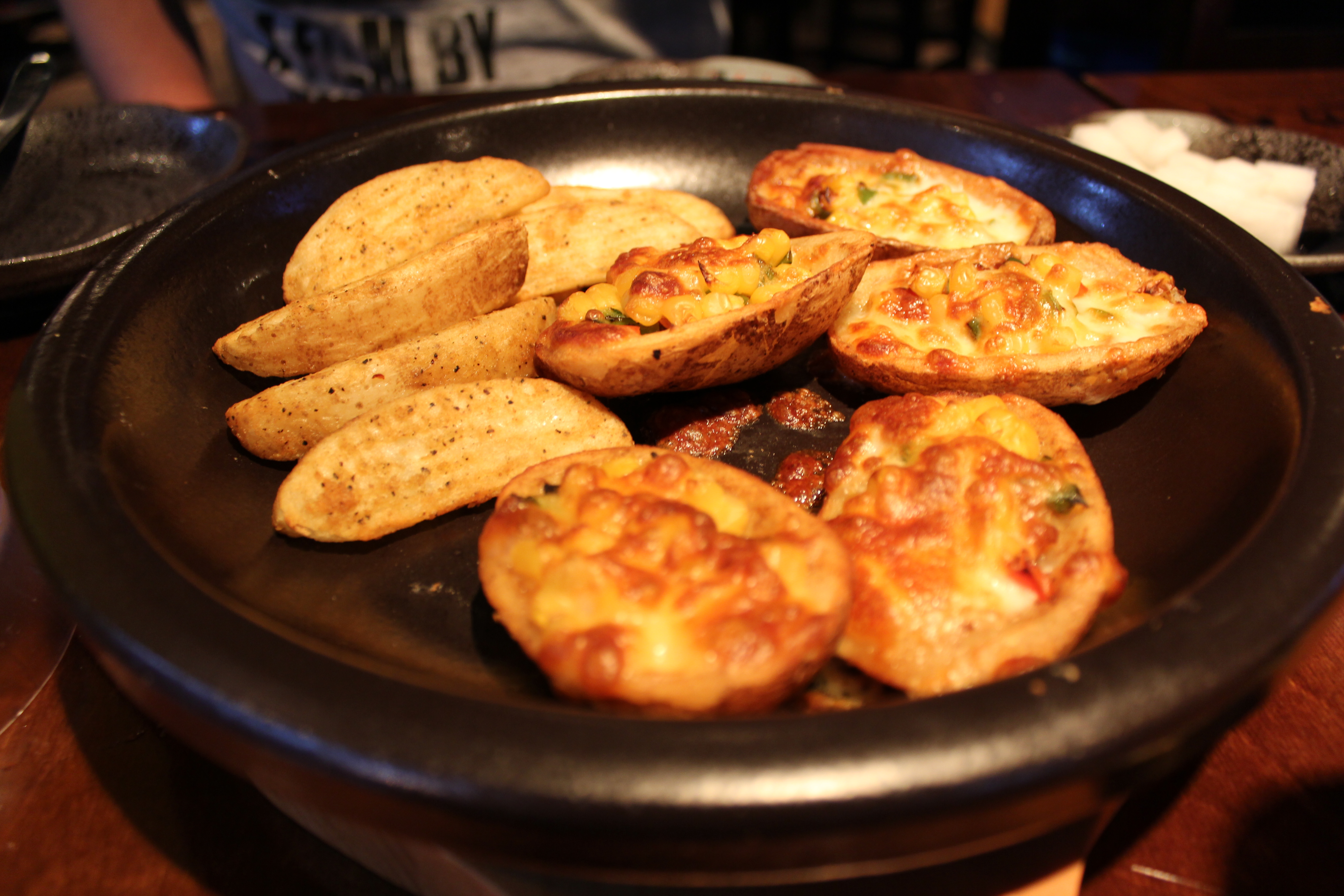What arrives is a plate with fried potato chunks and some uber-processed meat products.  We’re loathe to call these things ‘sausage’ so shall adopt the Korean word instead – sausagEE.