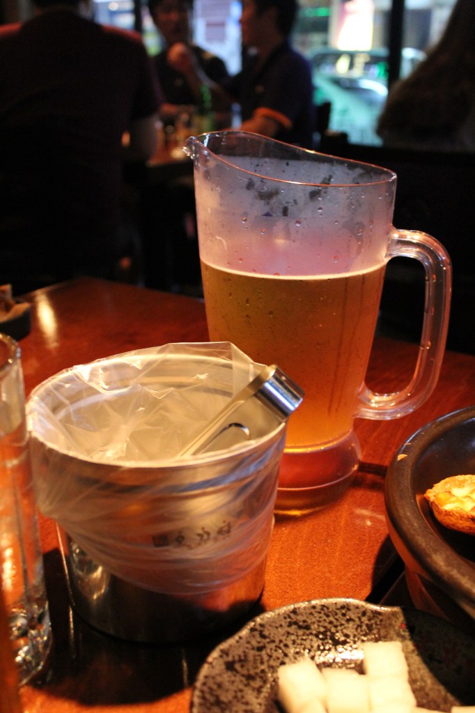 Dan gets home and already H-J is the full litre down and loving it.  Now instead of staying home and eating leftovers, Dan suggests hitting Okkudak – so off we go!  Upon getting there, H-J goes to order a coke but Dan declines and says he’ll have a beer…and instead of just ordering us a casual beer each, he proceeds to order a 1700cc jug which is nearly two litres.