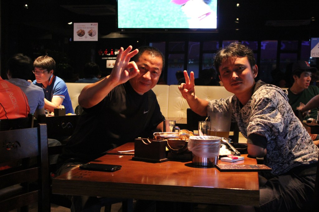 Its at this point we notice that the guys at the table next to us are waving and smiling and taking photos of US.  They are saying “China, China” and it turns out they are from China and speak no English.  Now we speak even less Chinese than we do Korean so we all end up speaking in one word Korean sentences and making a lot of drunken hand gestures.  Soon, they invite us over to their table and then we end up drinking their 1700cc jug with them…and THEN Dan orders ANOTHER JUG at which point we are decidedly all shitfaced and rowdy (and the Koreans are all staring at us judgingly, haha).