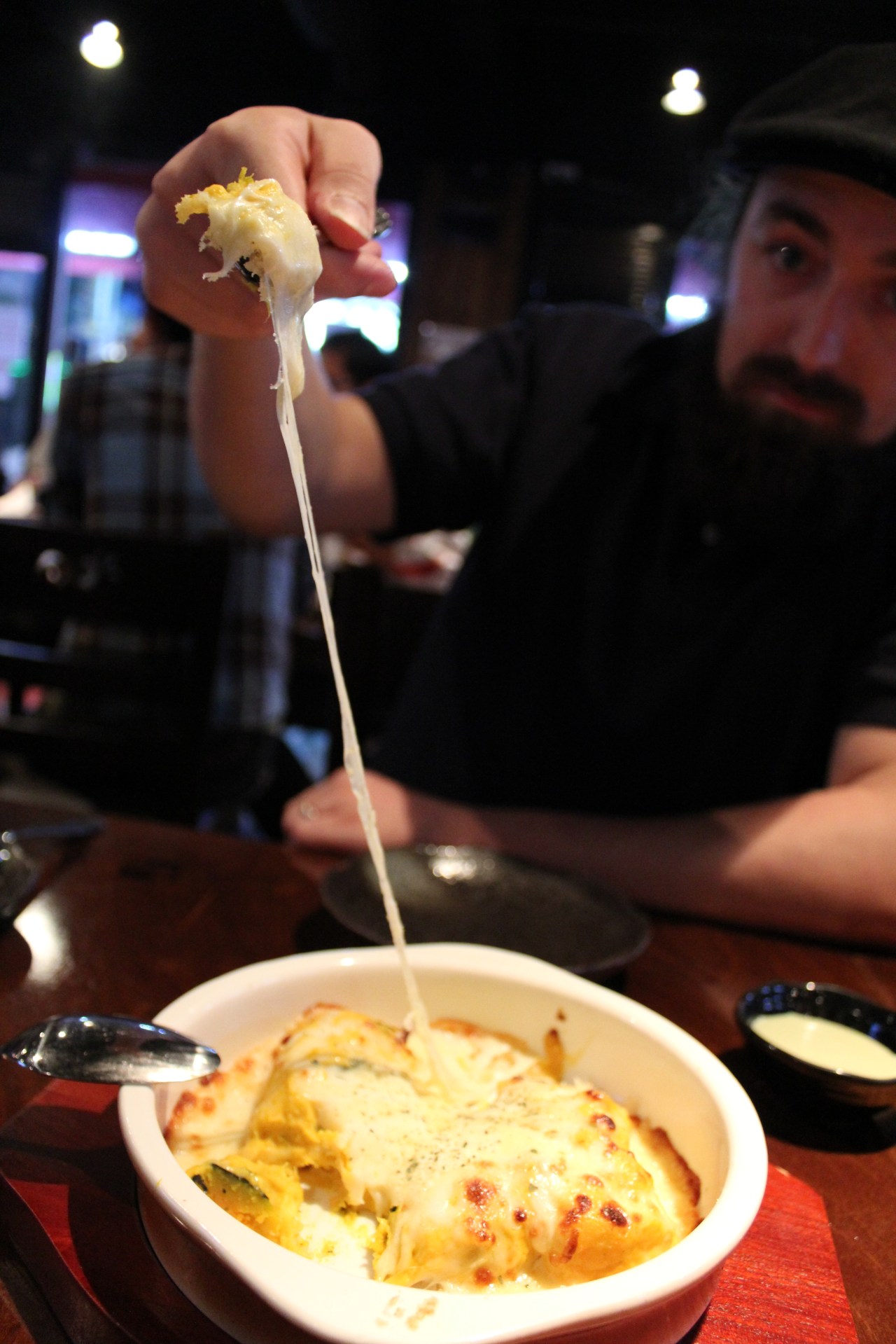 In an attempt to work our way through the side dishes page, we opted this time for the 고구마 &  단호박 (sweet potato & pumpkin) which came in an oozey cheesy delicious slop.