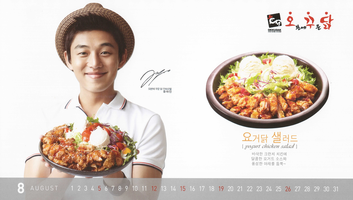 We ate and ate and ate, all the while we were waiting for something odd to happen – a random glance from a stranger, an unexpected lump of ice cream somewhere unwarranted….something?  Anything?  Nope, not a thing this time round, just a damn good dinner of fine chicken products with associated accompaniments.  Having ordered far too much even for our two tables, we eventually conceded defeat and got a box of our remaining chicken to go.  Goodbye to Okkudak for now.  Thanks for the good times!And for those of you who want one more look at that ice cream salad, here’s a picture taken from the Okkudak Calendar, featuring Yoo Ah In, a Korean actor who digs his chook.