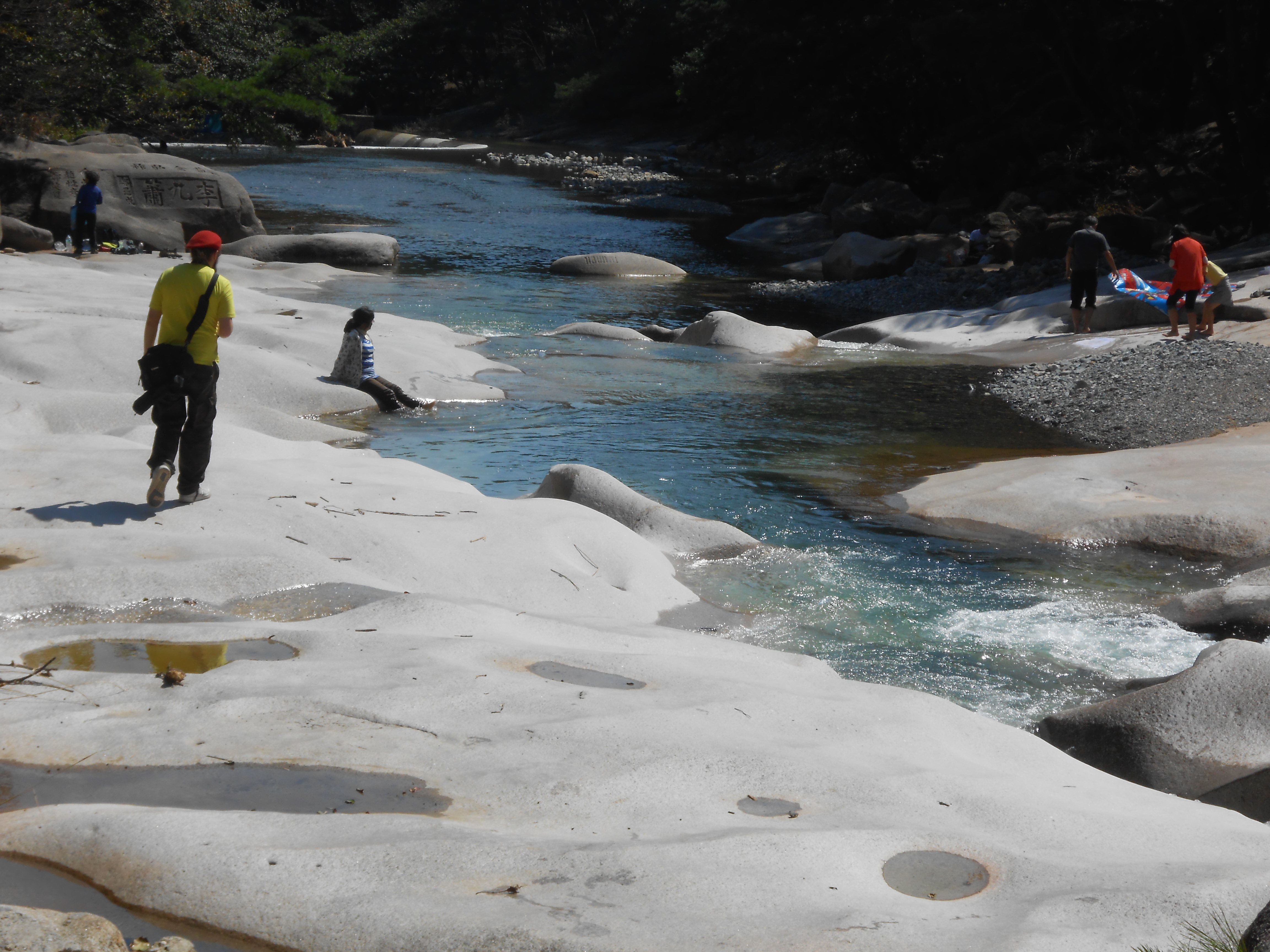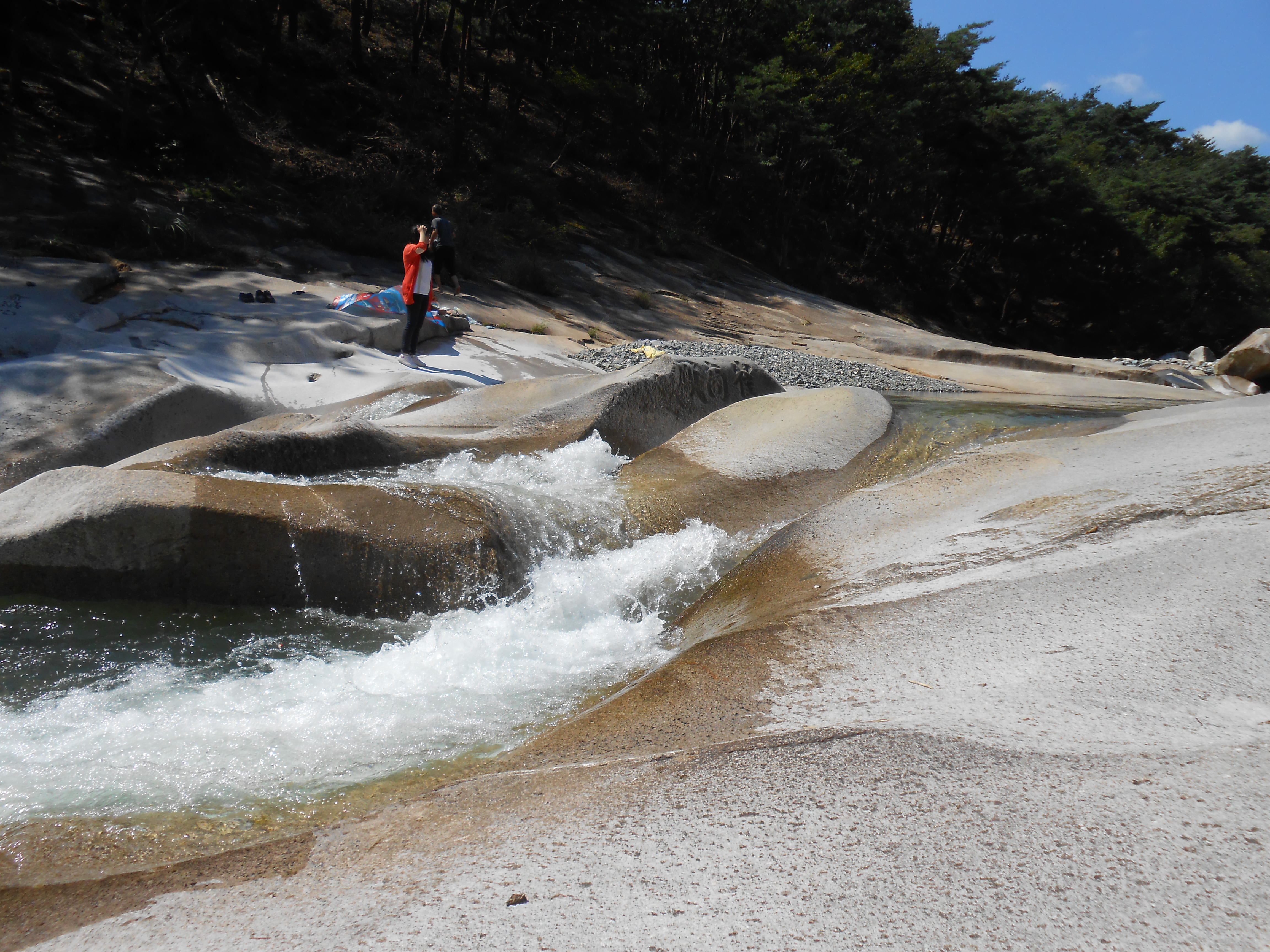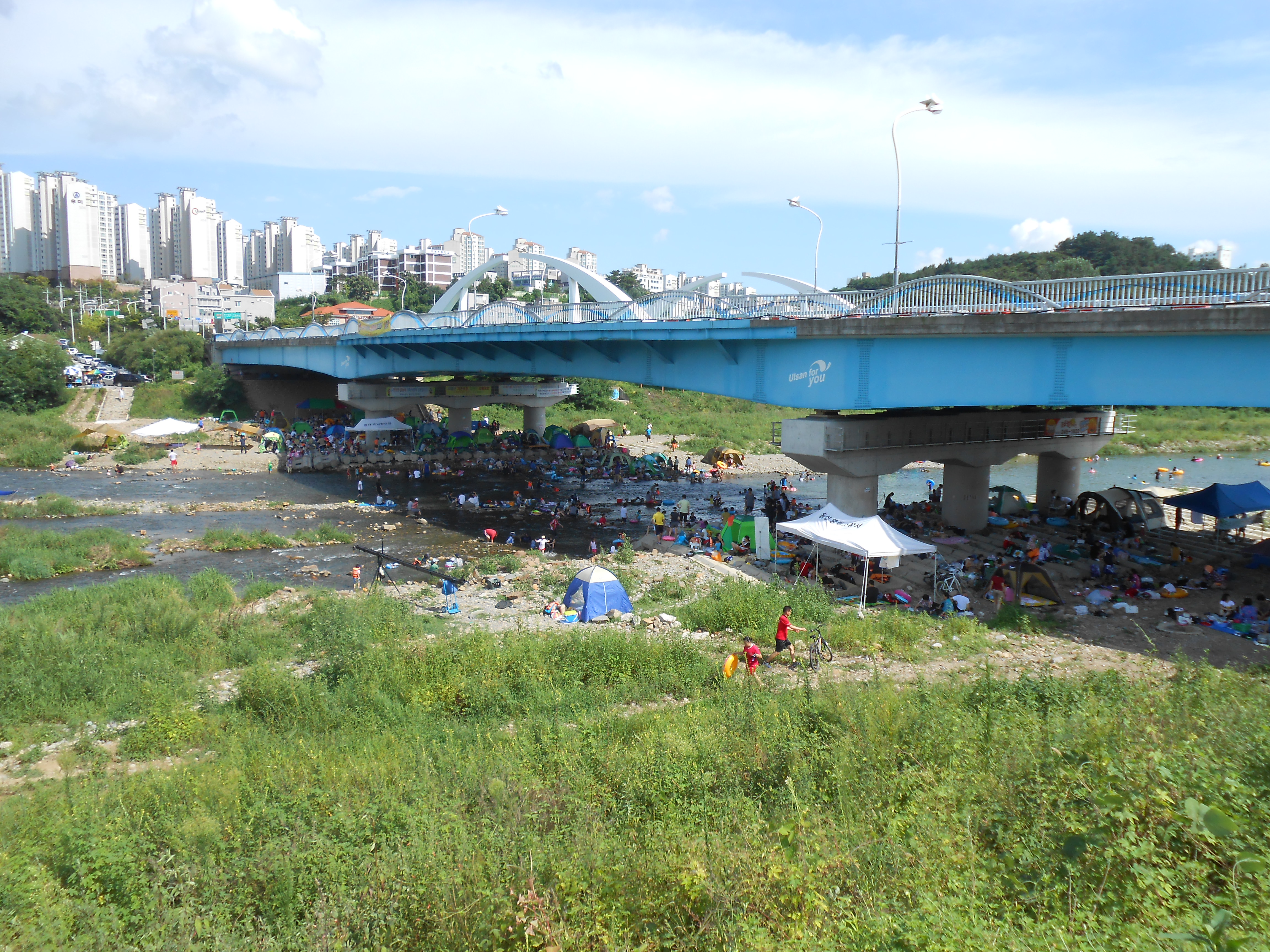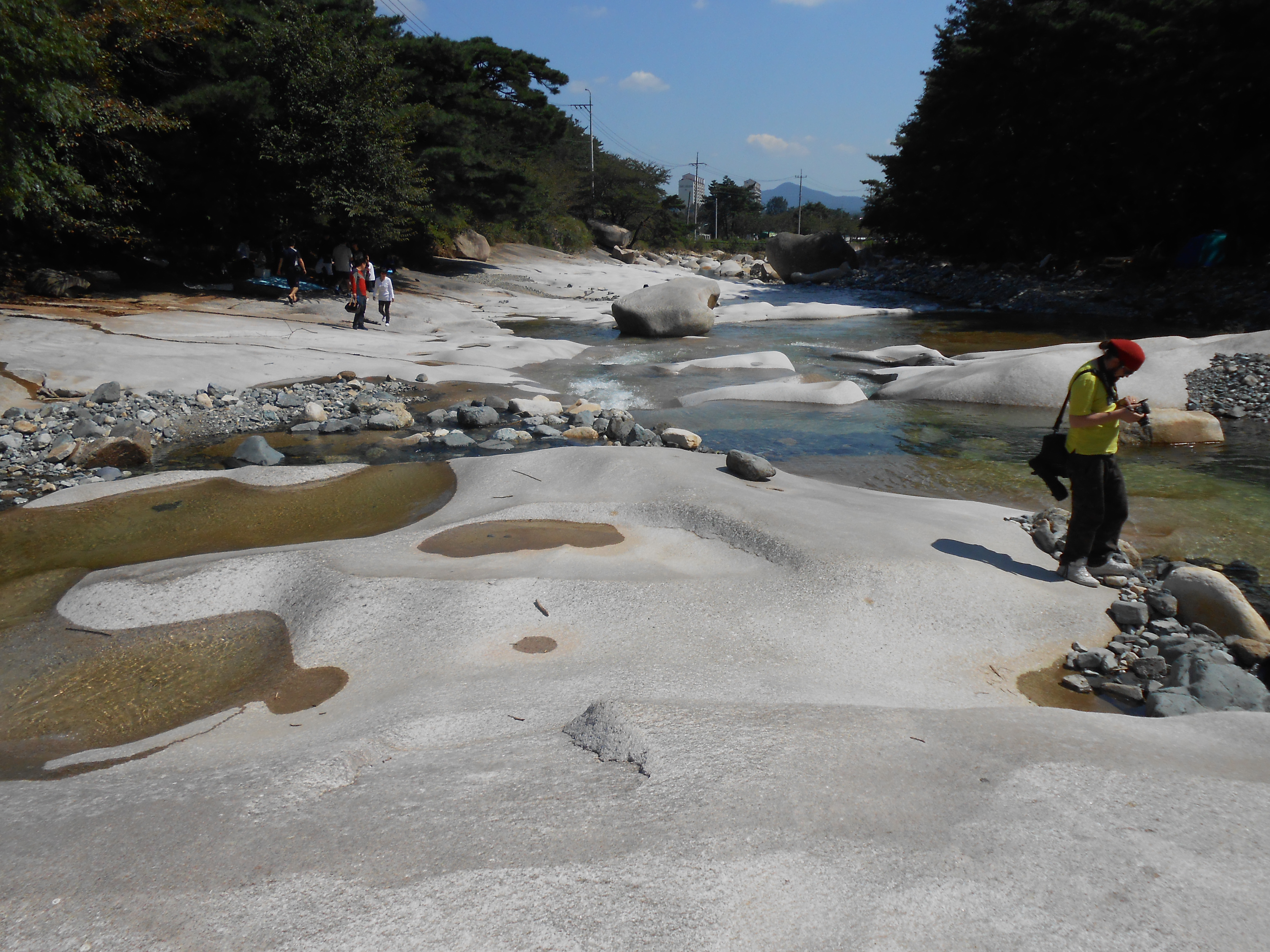 Feeling the pinch of time and not being able to immediately identify which bus to take, we hopped in a taxi with the thought that nothing is very far away in Ulsan…but as we kept driving…and driving…and driving…and driving, the fare on the meter kept increasing and increasing. 12,000 won later we finally stopped and were thrust forth into the bosom of another Scenic Site of Ulsan. There were families everywhere lapping up the searingly hot summer day, splashing in the water of the upper reaches of the river, reclining under the bridge and generally enjoying the peaceful escape from the city hub.