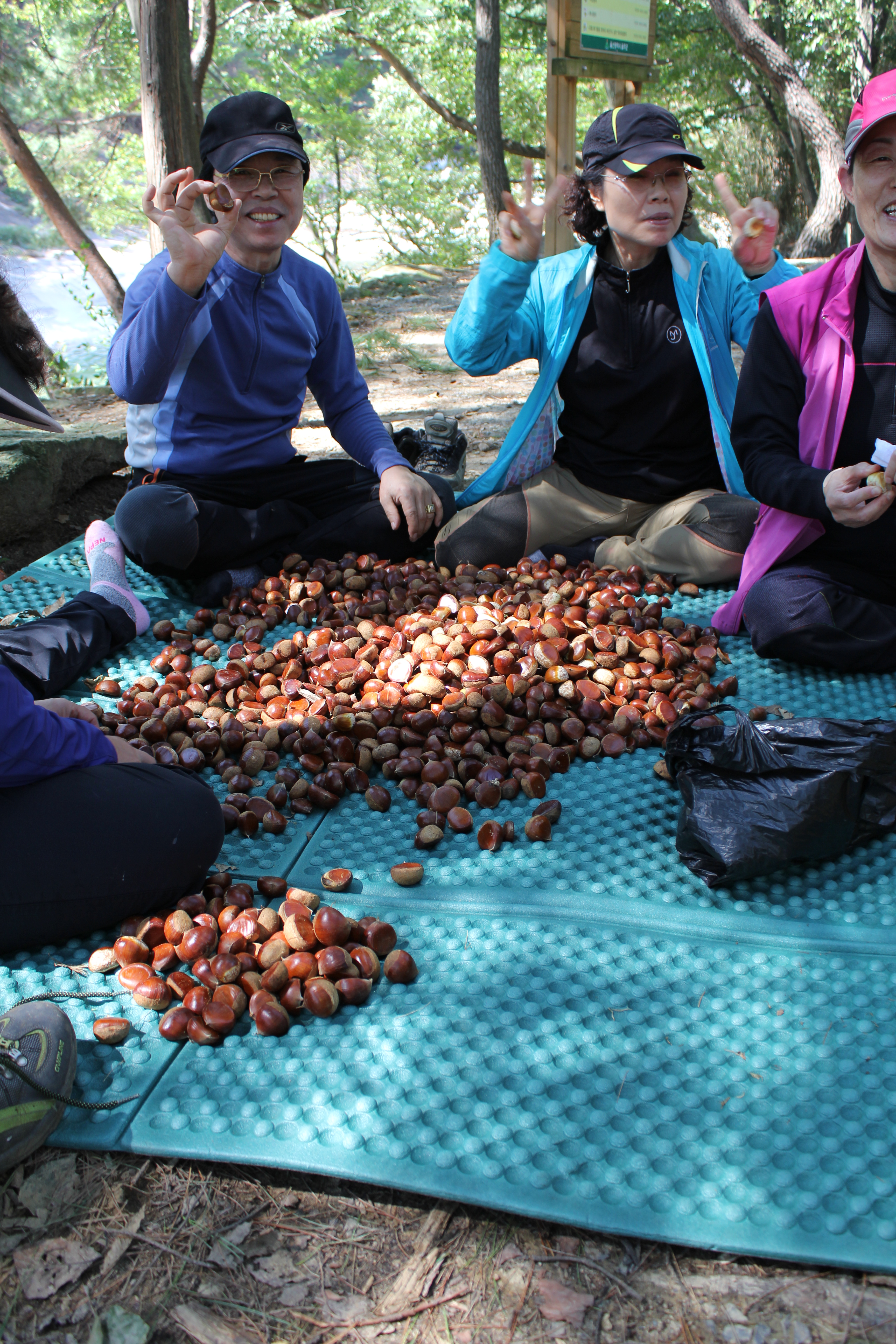 Having seen many hikers during the course of our day so far, we were intrigued to know what they were all carrying in their largely bulging day packs. Just how much kimchi could one need for a day’s outing, we pondered. Attracting the attention of one such group, they proceeded to empty their packs onto the ground below, from which poured forth hundreds of chestnuts…