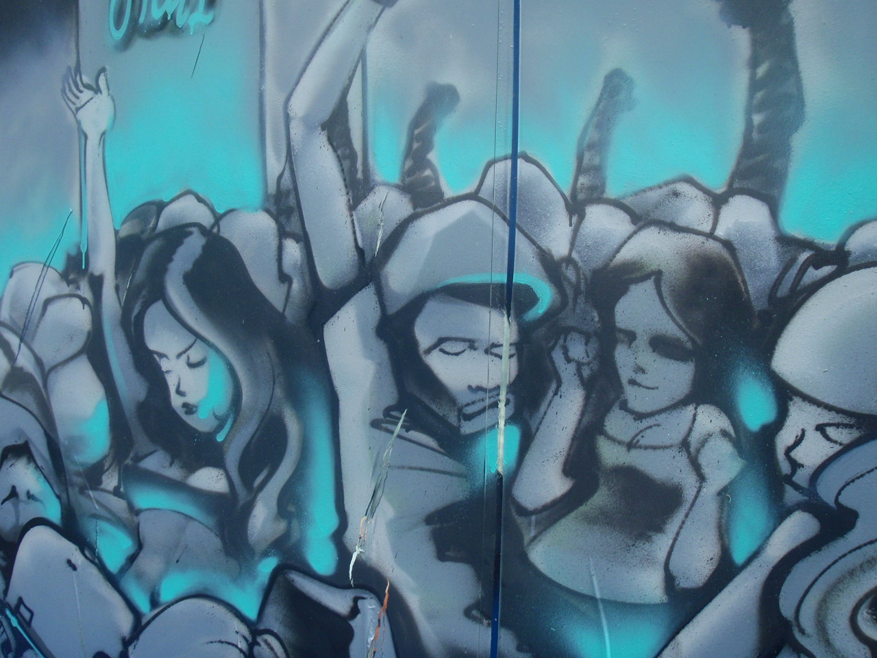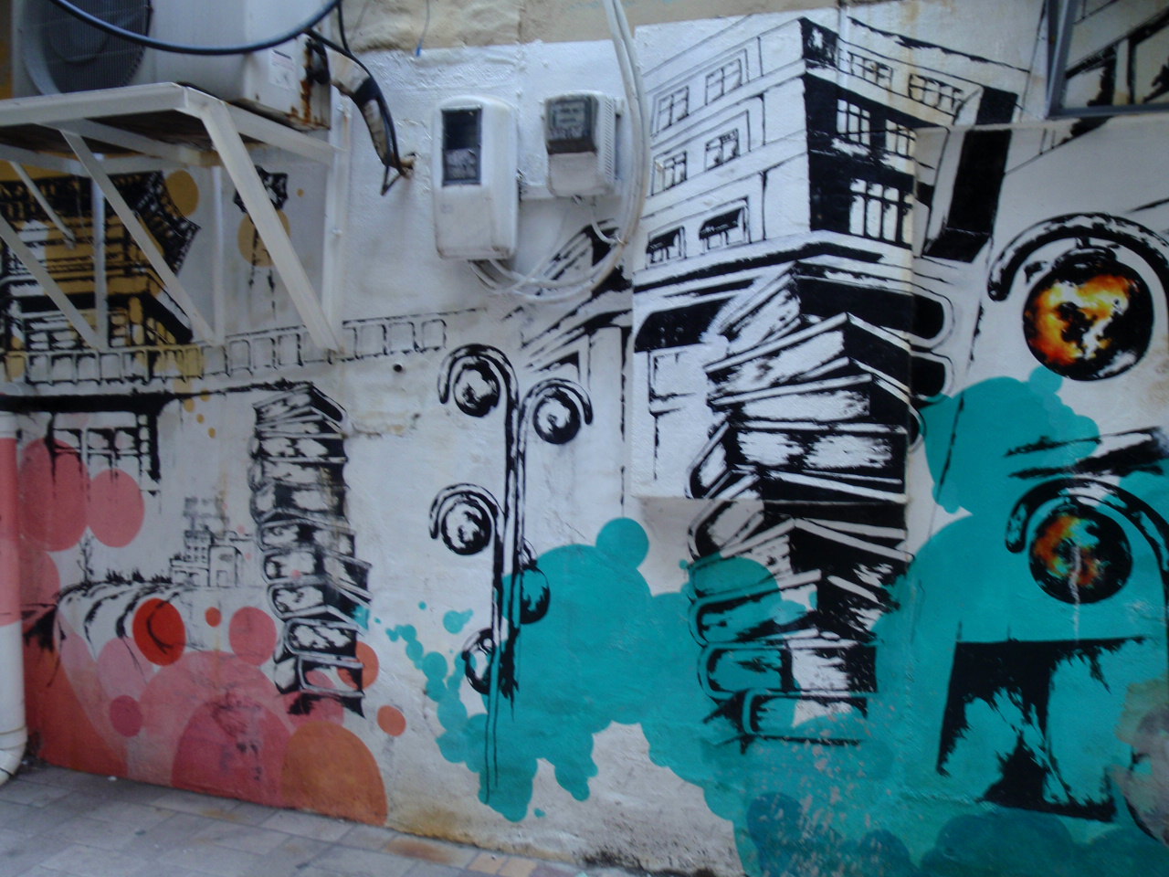 Different styles of street art line the walls of this dark little side street.