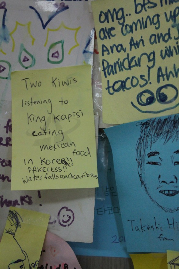 One of our most memorable moments in Busan was here one night when we were quietly eating our dinner before getting the train back to the village. While our senses were primarily focused on taste we noticed some familiar music being played in the restaurant – The Dudes??? A Kiwi band being played in a restaurant in South Korea? What were the chances?! Enjoying the food and now the music, we were stoked when the playlist then played a track by Herbs, another epic Kiwi group. We told the chef that we liked the music and she replied “New Zealand music, very good!”. Wow!!!! After another round of quesadillas, some King Kapisi and the Decepitkonz…damn! Stop, drop and roll…We fell 100% in love with place!