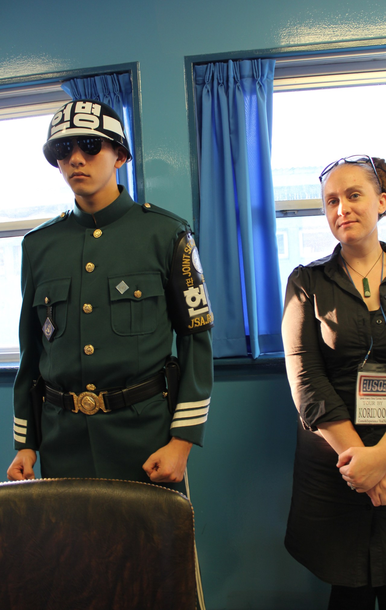At this point, things got a little more serious which was unfortunate really as Dan was still feeling like crap and H-J was repeatedly dissolving into giggles at Dan’s lack of ability to hold on to his liquor AND due to exhaustion.  Drilled repeatedly by the soldier in charge of our tour not to engage in any form of communication with the North Koreans who were peering back at us from their side of the line.  This meant no gestures of any kind – no pointing, no pulling faces – which was slightly hard to remember with a pounding head.  Certain members of our group were told off more than once…Funny to think that while you are looking at a building in an area that you could be shot for pointing or pulling a face.