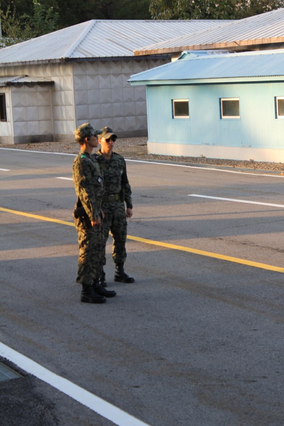 The South Korea dudes (otherwise known as soldiers) peer intently at the North Korean dudes across the demarcation line and stand with half their body obscured killing two birds with one stone – first, it presents less of a target to the enemy and second allows them to discreetly signal their back up when needed.  Smart cookies, really.
