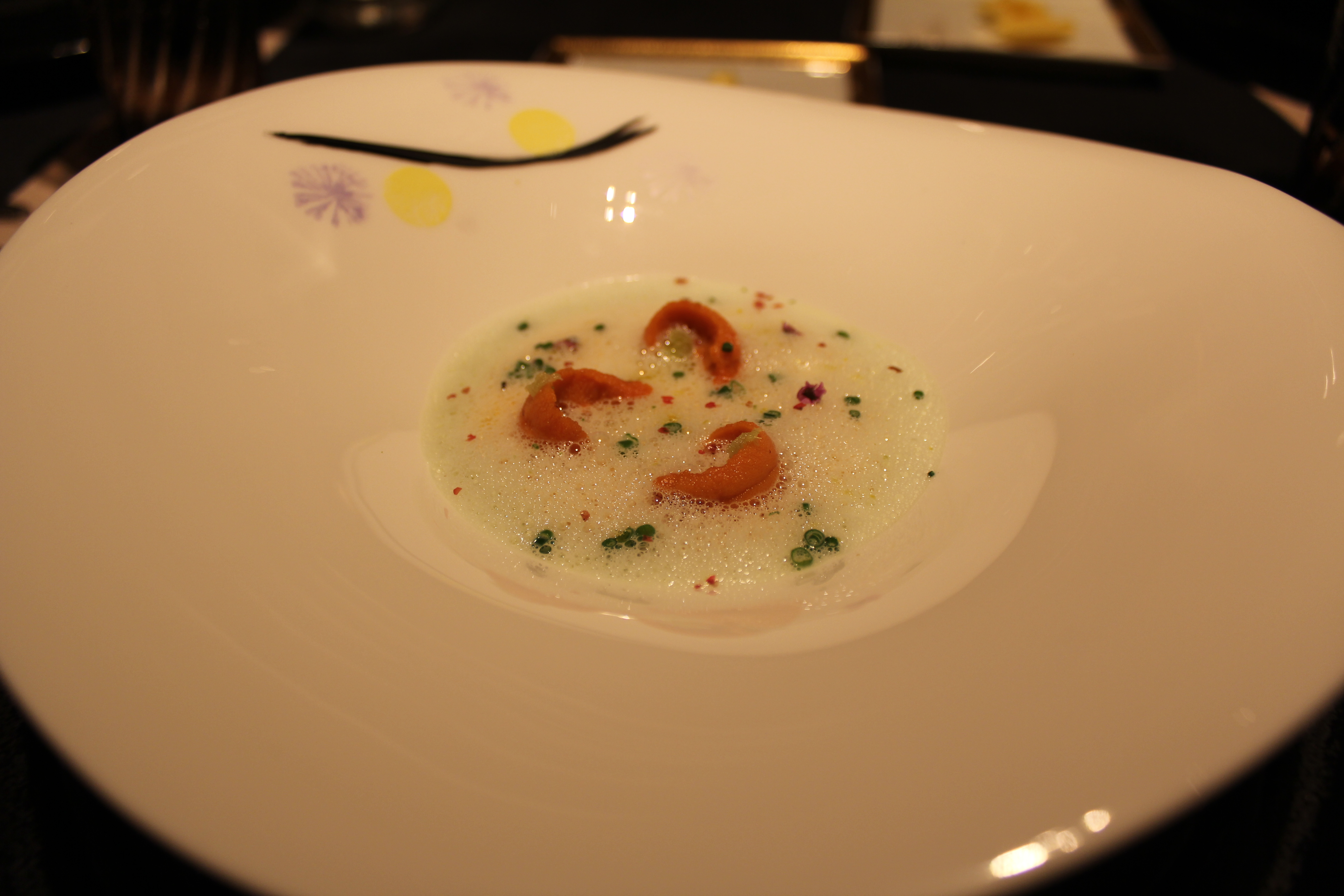 Sea urchin zephyr with wasabi foam.