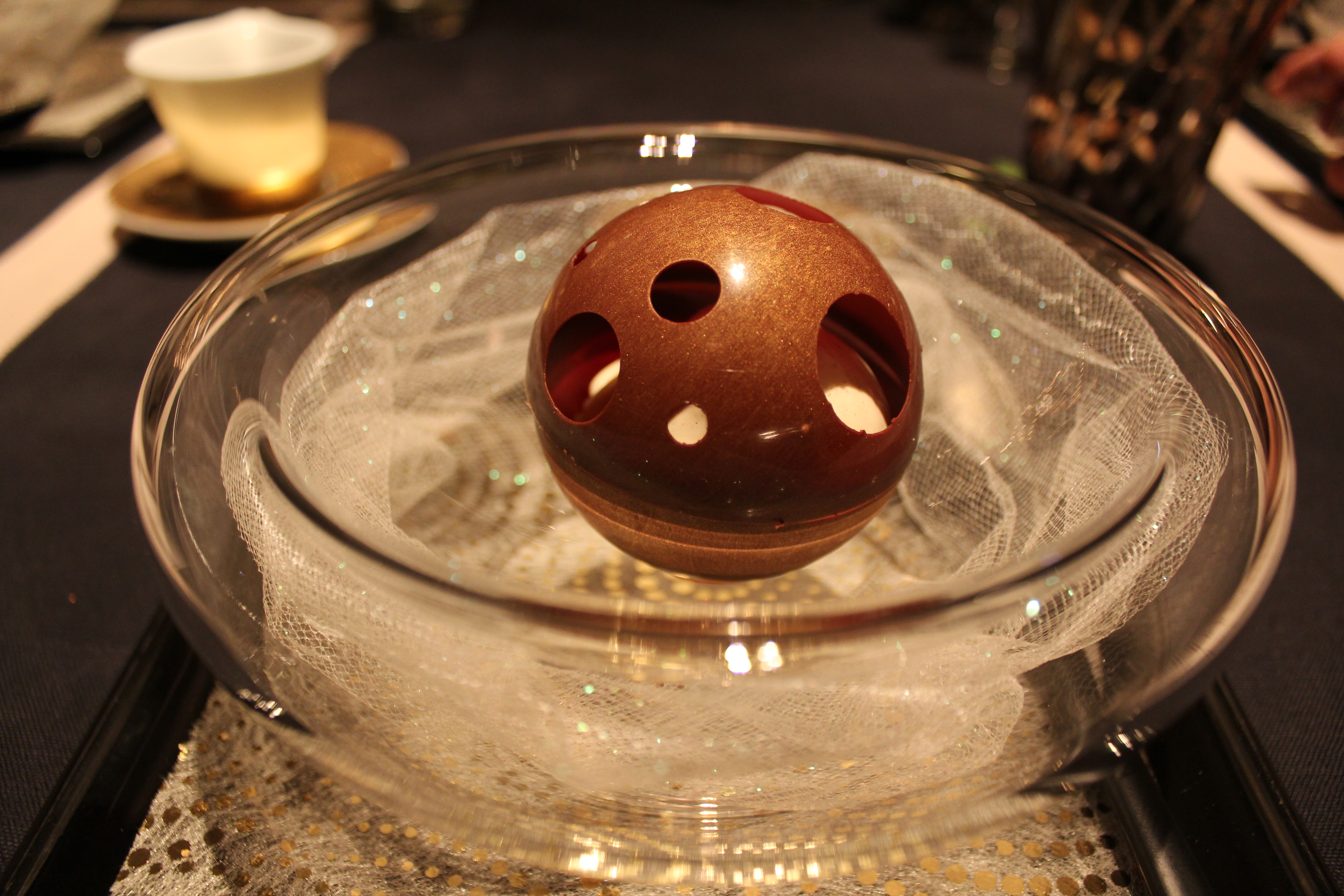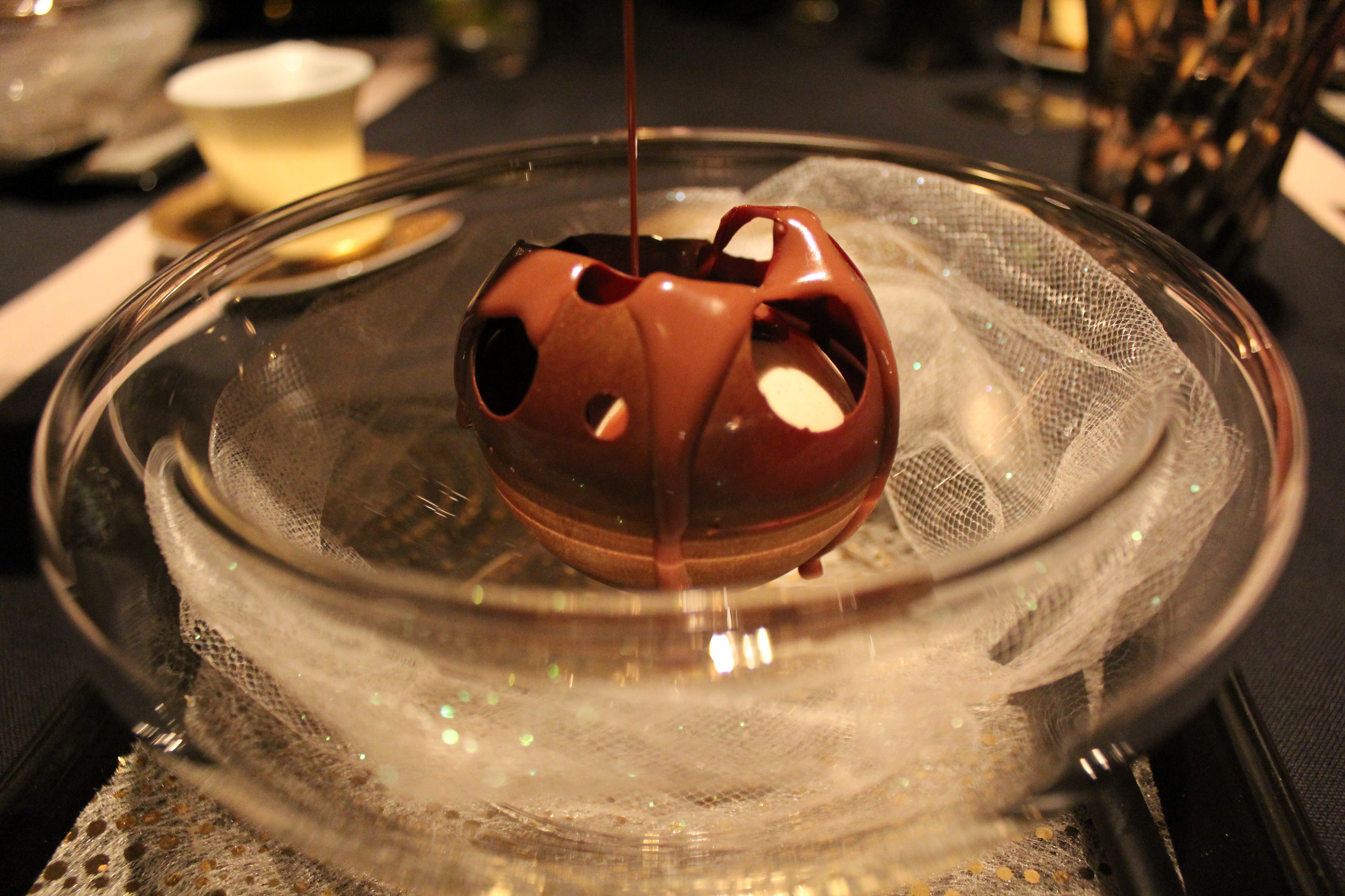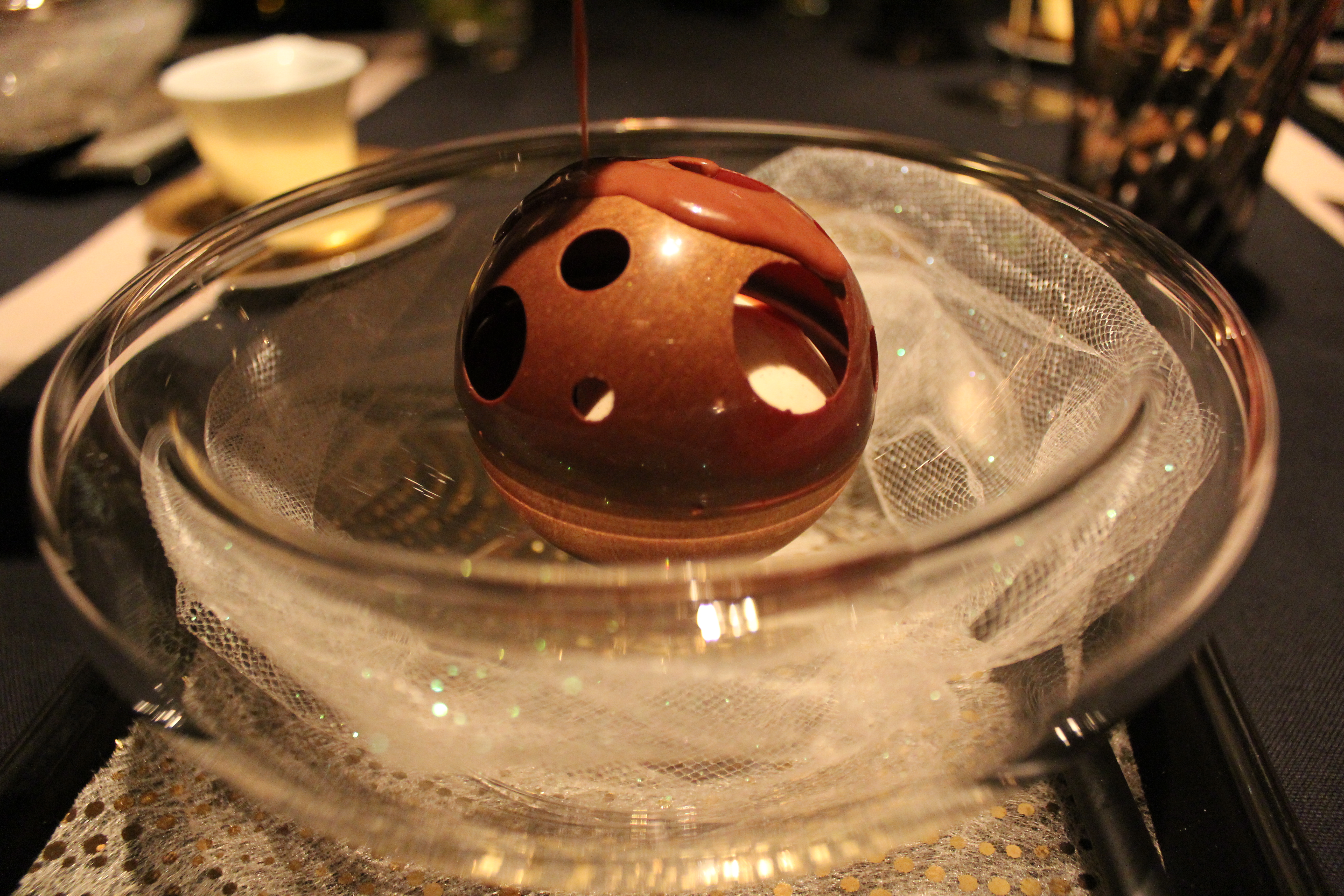 Araguani chocolate mousse with caramelised pear sponge cake. This particular dish was served with a humble little jug of chocolate and caramel sauce, poured table side by a god, allowing the delightful little sphere to dissolve like magic before your very eyes.