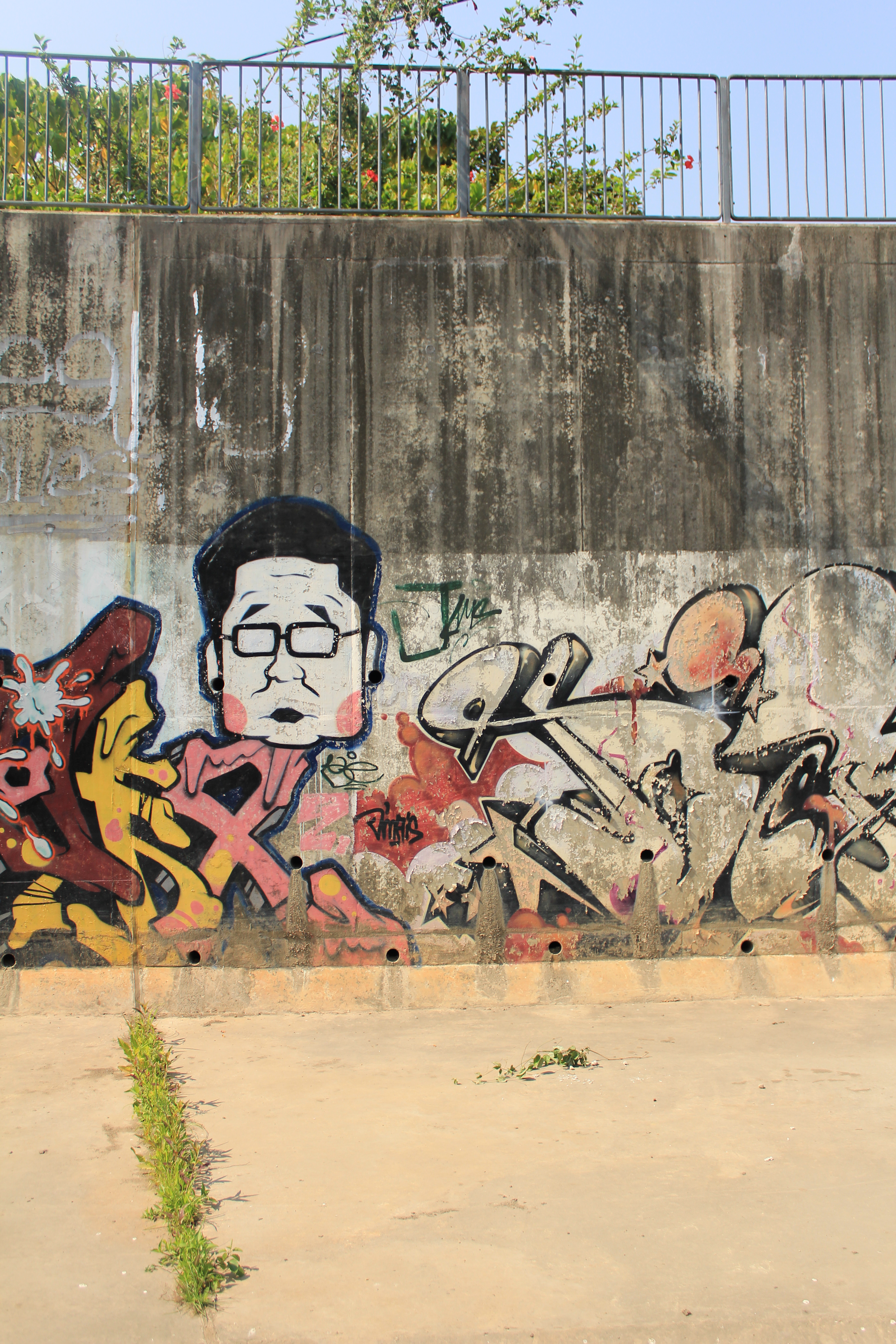 Over our past couple of years in Asia, we’ve managed to encounter a bunch of often unexpected but always impressive street art collections.  Yuen Long, a spot in the northern reaches of the New Territories is a wicked little spot housing low(er) rise buildings, an eclectic mix of nationalities, the funkiest, most Caribbean music we’ve heard since, well, we lived in the Caribbean, together with delicious cheap street food and a Sunday neighbourhood street party vibe.  Oh yeah and to top it all there’s an epic river bank full of art.