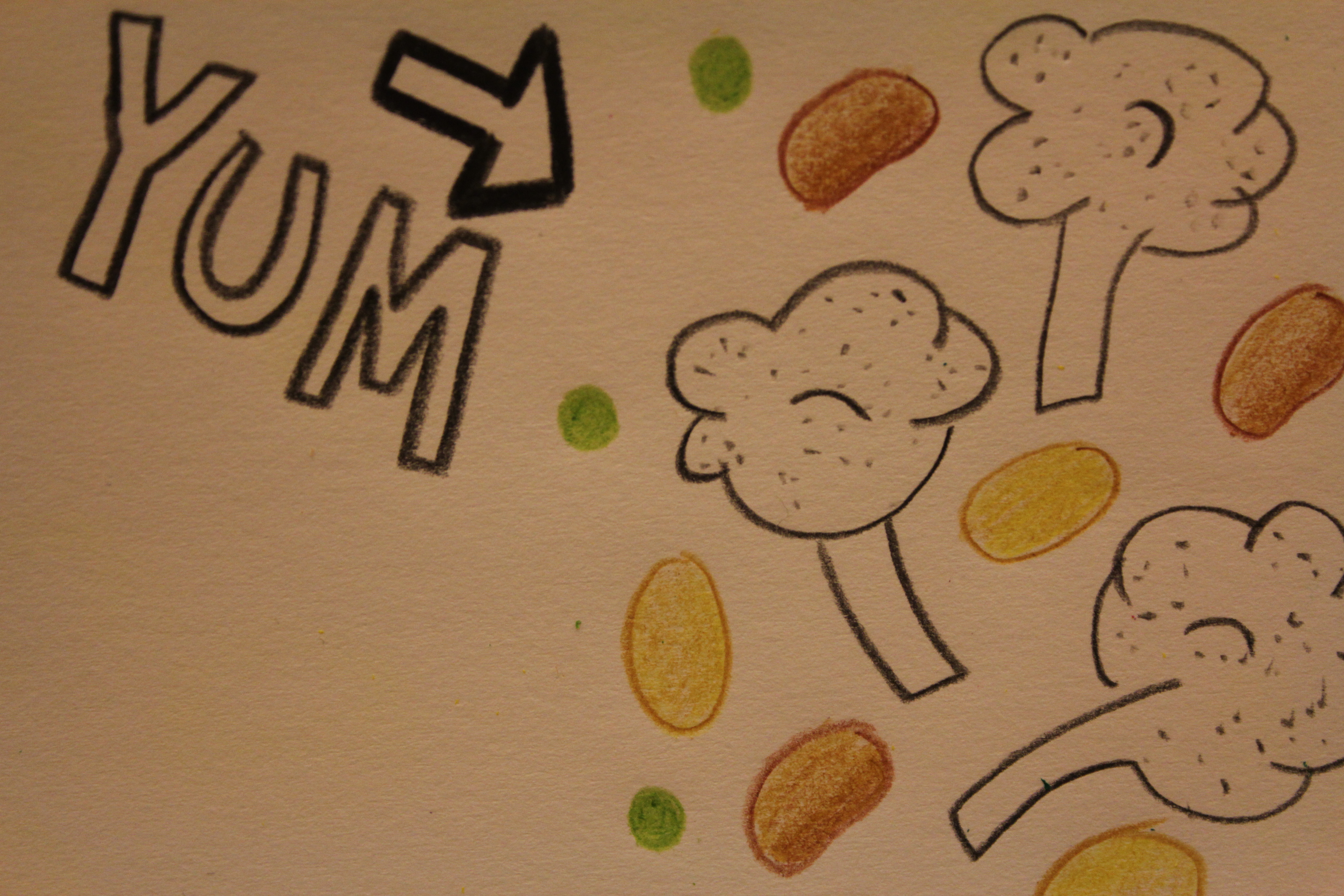 Course number 1, roasted cauliflower with chestnuts and raisins, was so delicious that we scoffed it down before remembering we should have taken a photo of it.  Harking back to our cameraless stint in Korea, we have rendered a picture of said dish using the power of our memories and our coloured pencils.2014-01-04 22.26.59