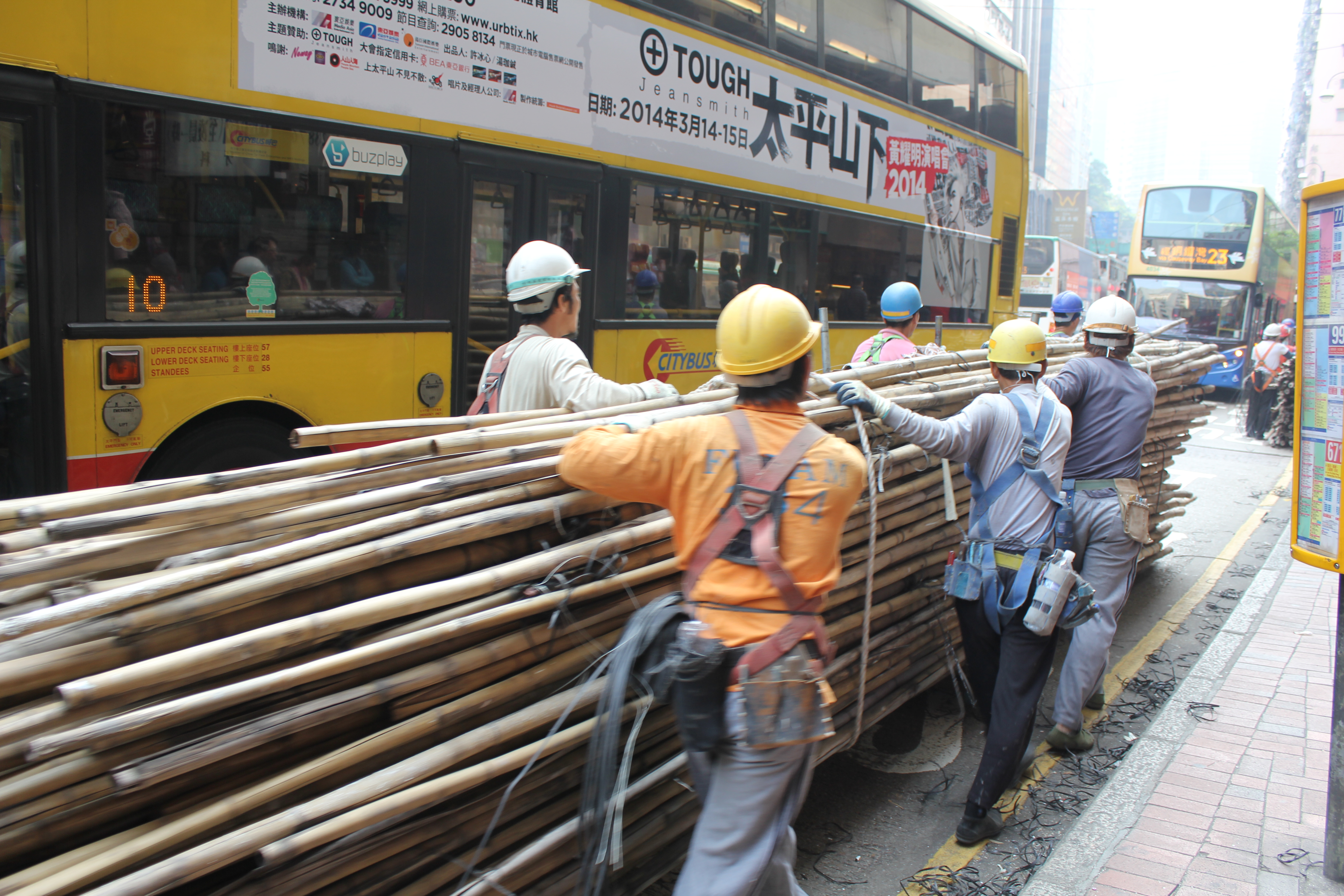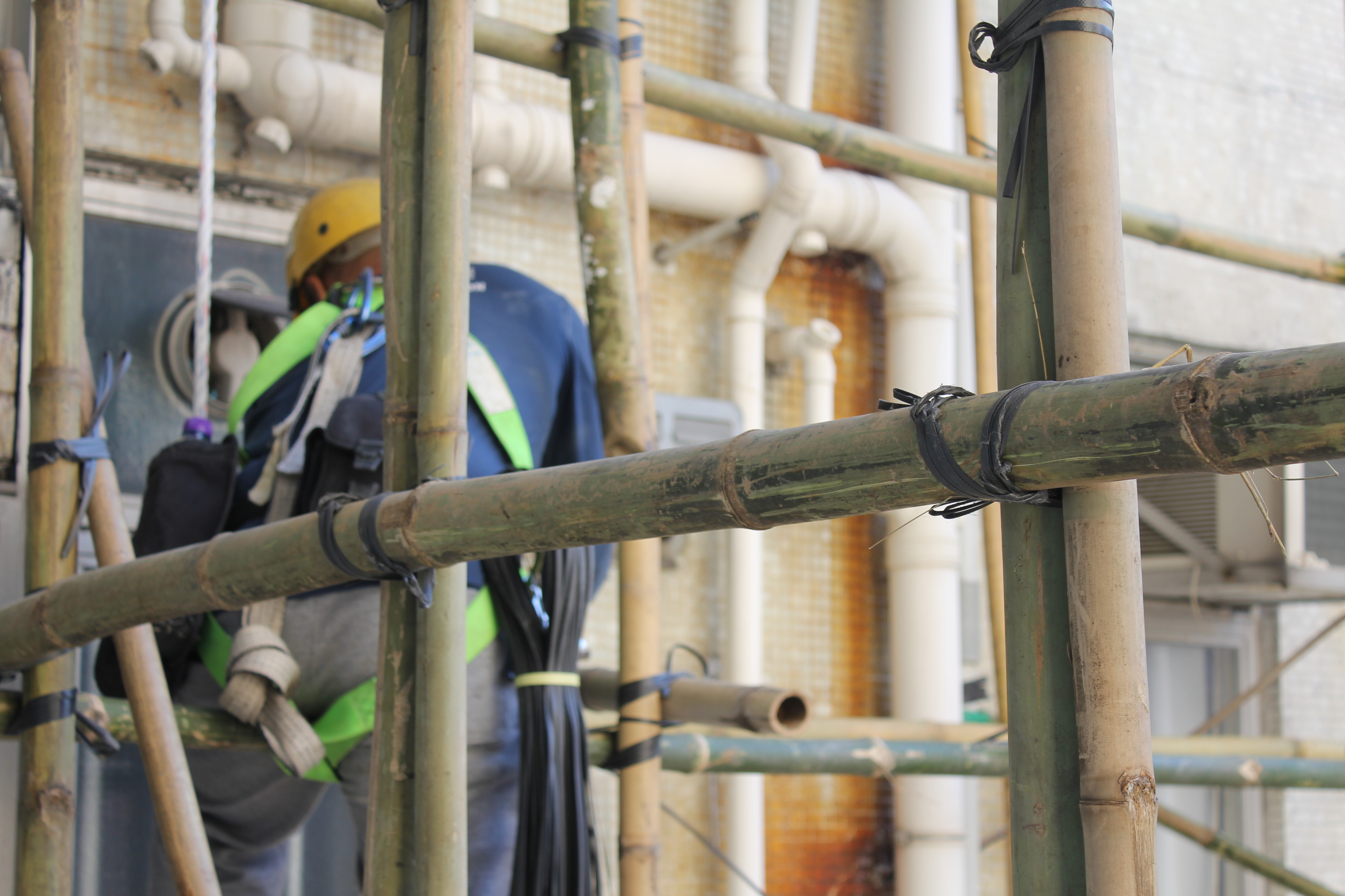 The 23-foot poles arrive at the worksite, are plonked on the ground in piles and are passed up from the ground, often by women and men of quite advanced age, and kinda shimmied up the the sides of the buildings using a combination of ropes and hands.  Said poles are then tied together using what look disconcertingly like those twistie-tie things that adorn the tops of bread bags.