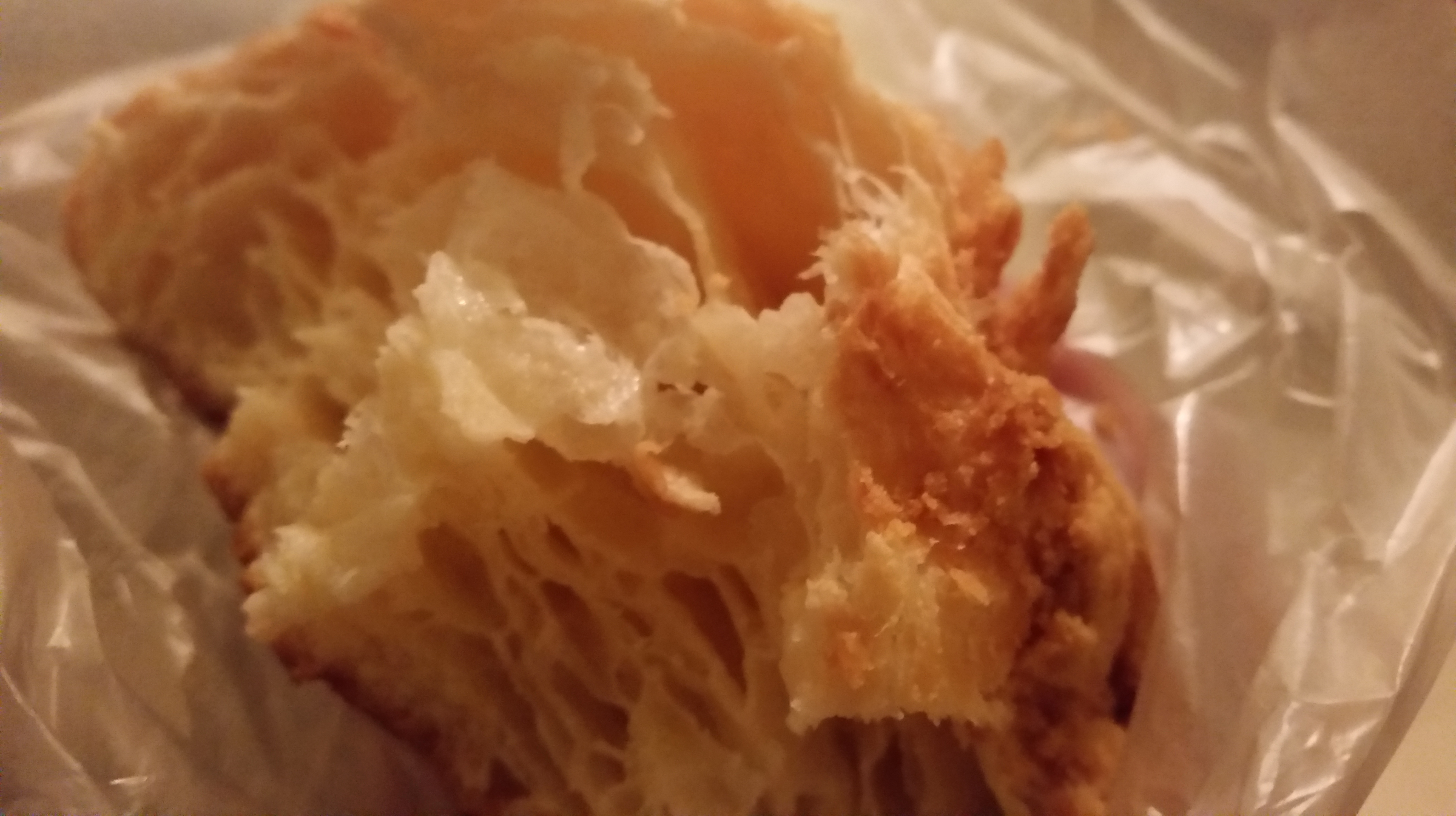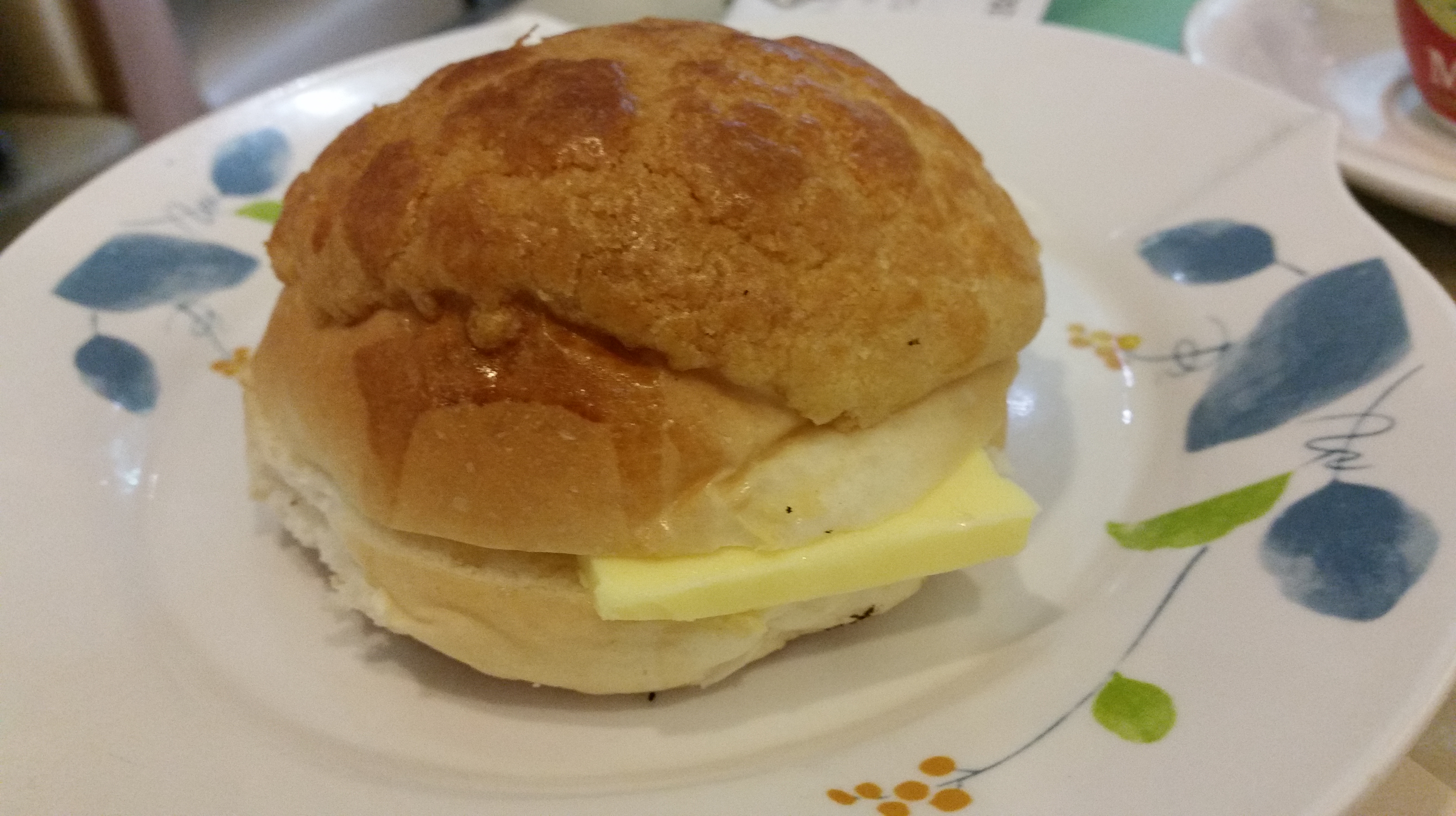 A huge bun, with a much more croissant-like texture and a crunchy sweet topping.  No butter in these puppies but the texture is definitely a nice change from the still kinda-weird bun type that prevails.