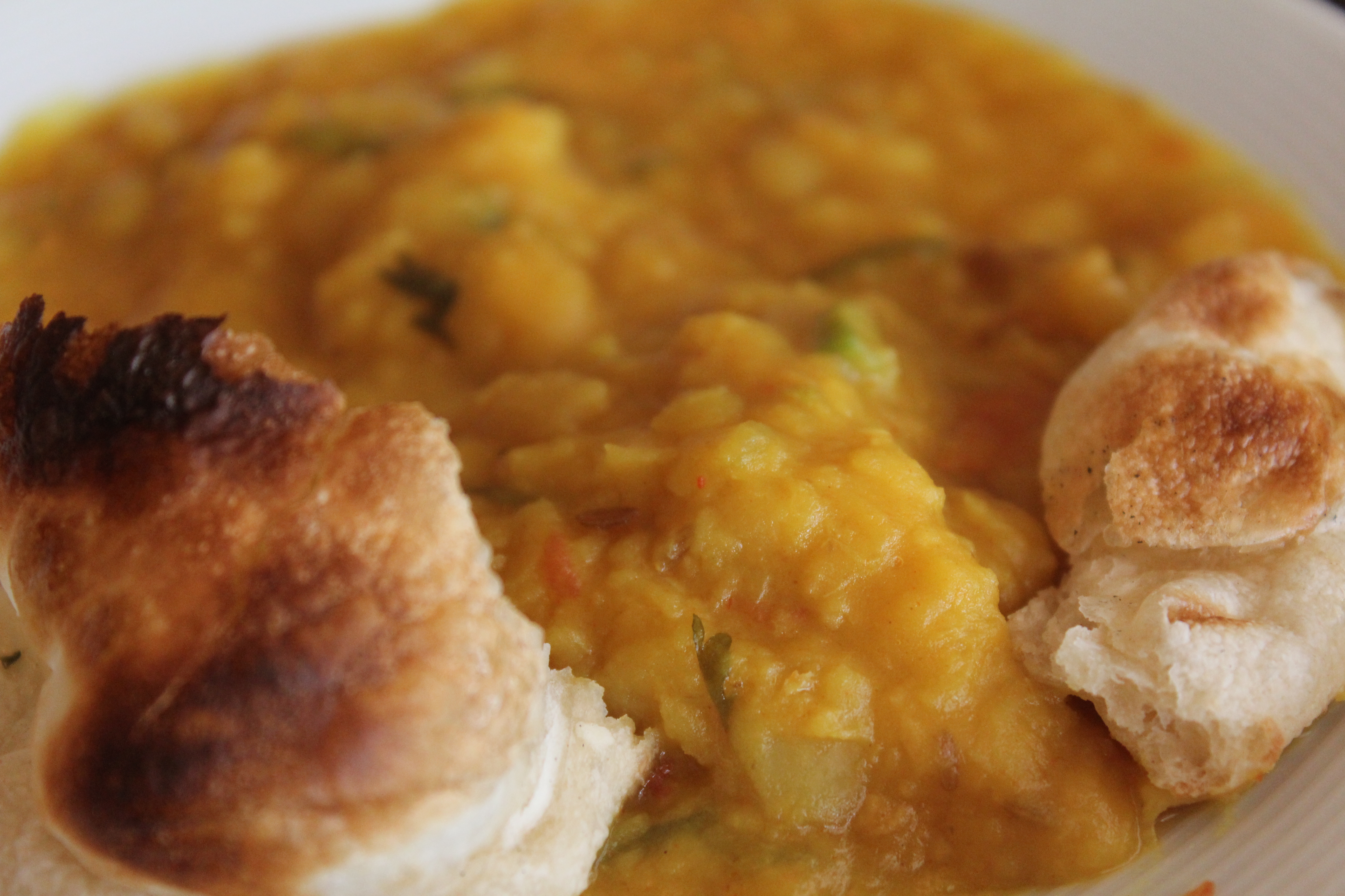 Dip hot dumplings in the dahl, then garnish the lot with freshly chopped coriander and thinly sliced red chilies to add a burst of colour.